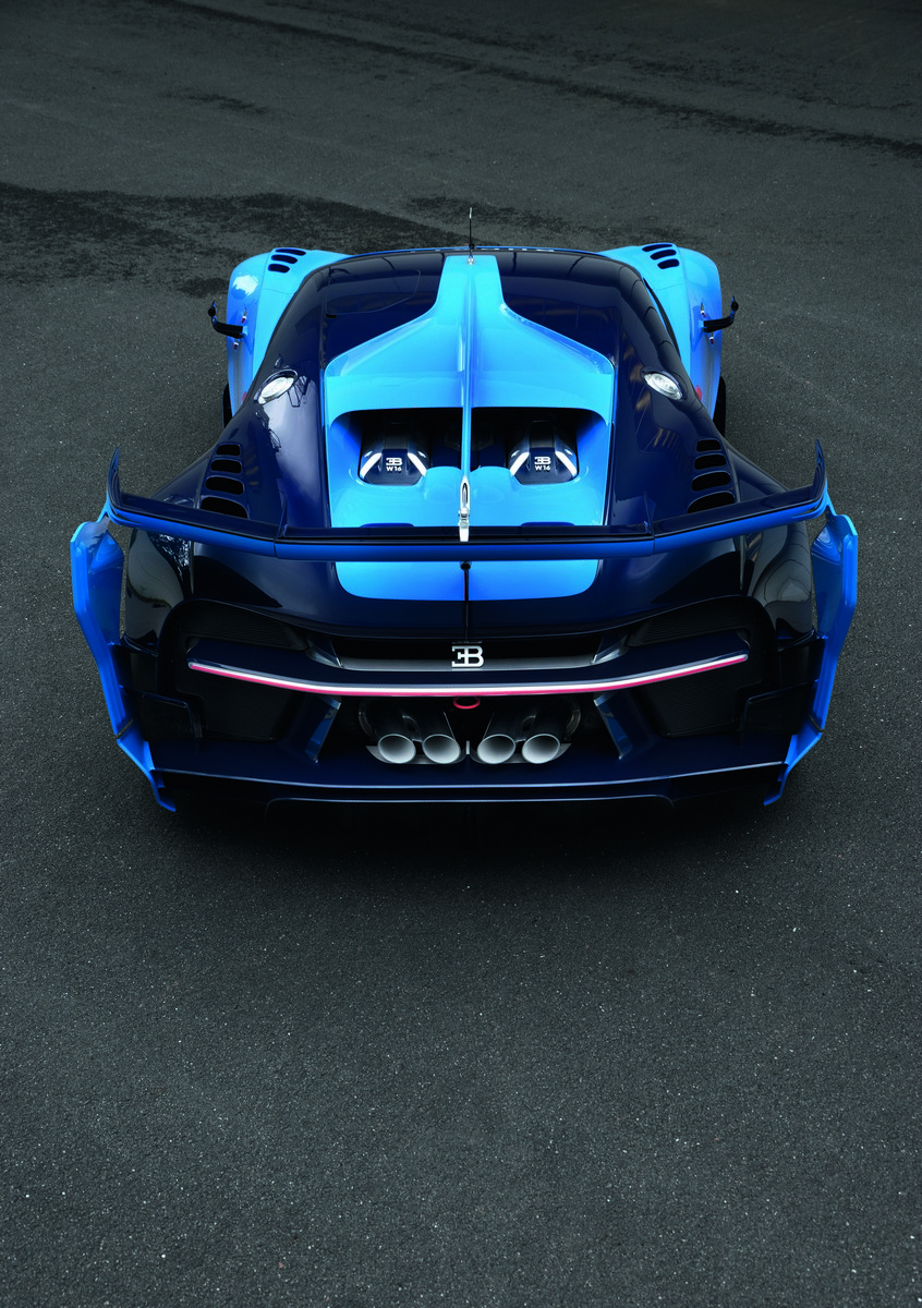 the rear of the vehicle has a strong trailing edge which provides excellent driving stability, exhausts the hot air from the engine compartment and, no less importantly, unmistakeably shows the virtual competitor that a bugatti is getting ahead and away from them.