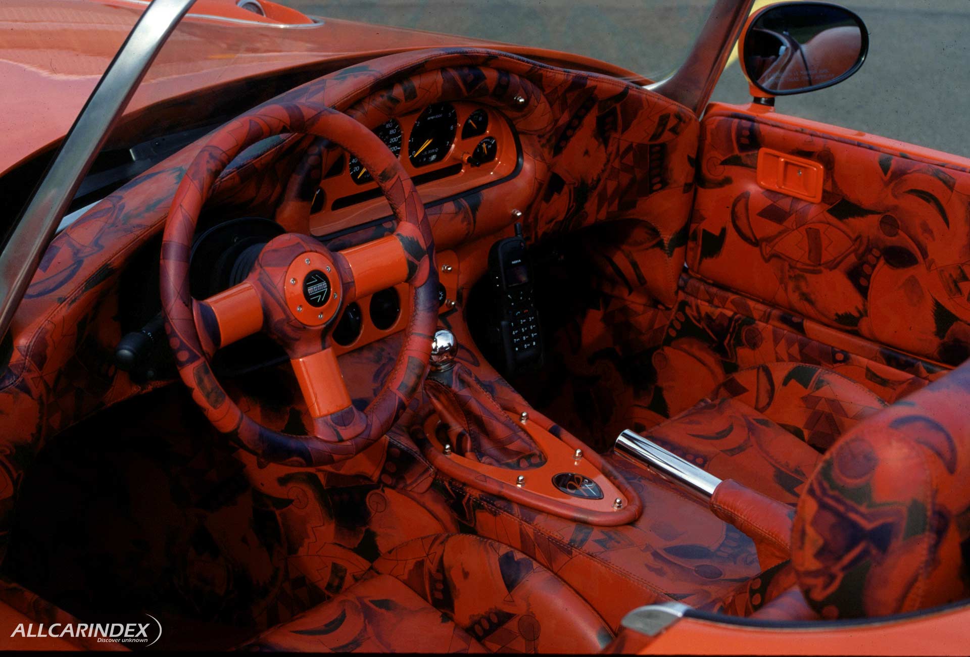 The wheels and tires filled the arches as if measured with a ruler: Pirelli P Zero 225/40-18 at the front, 295/35-18 at the rear, mounted on three-piece chromed aluminum BBS rims sized 8½×18 inches front and 10×18 inches rear. The cabin followed the same tidy brief. Exclusive leather, proper bucket seats, a discreet stereo with a Pioneer CD changer, and a Momo steering wheel handled the essentials. A Nokia C232 provided period-correct mobile communication. De’Shama produced matching luggage in hand-sewn plastic and leather, and Burg Design supplied the exterior and interior labels and decors.