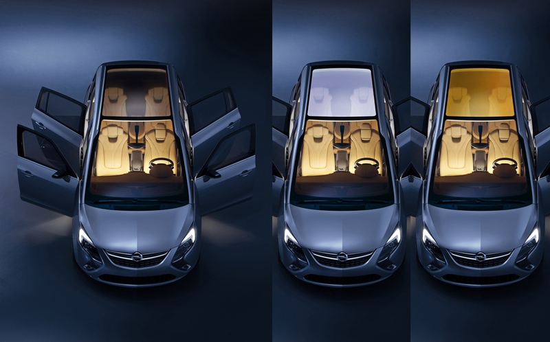 true to lounge feeling, the zafira tourer concept interior is bathed in light thanks to a panorama windshield that seamlessly flows into a generous glass roof which extends to the rear of the car. a special touch is a second pane of high-tech composite material that is edge-lit by leds. tiny metallic particles are embedded in the plastic to reflect the light and give off a cozy, warm light that can be varied in different shades of yellow. this reinforces the homey lounge ambiance and lends the interior a glowing character while achieving a harmonious balance with the outside world.