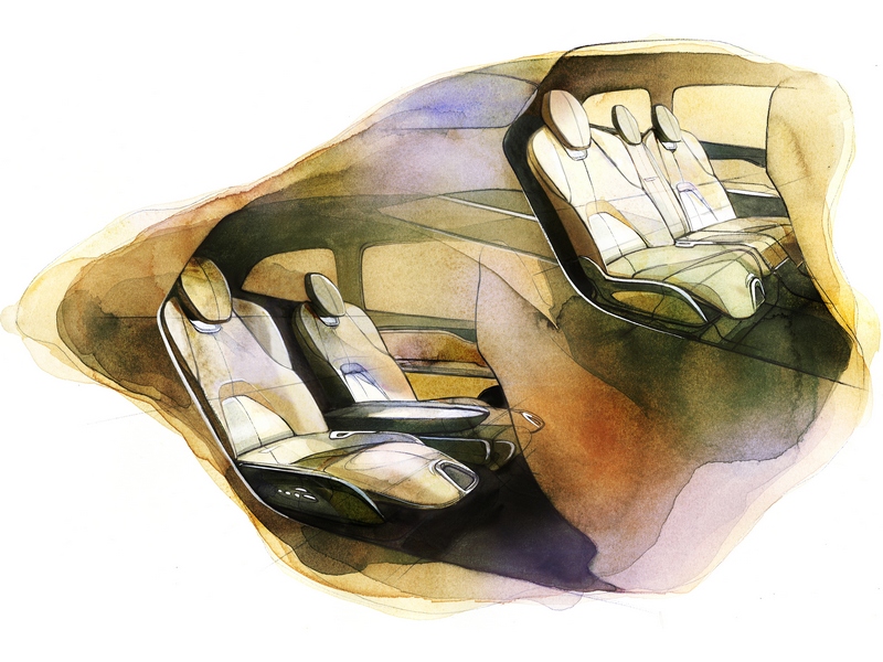 seats tailored in high-quality caramel leather with color-matched quilted seams and stitching, contrasted with cocoa dark brown door trim, soft deep-pile carpet and a host of premium materials pleasant to touch, underline the monocab’s exclusivity.