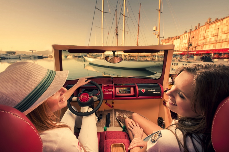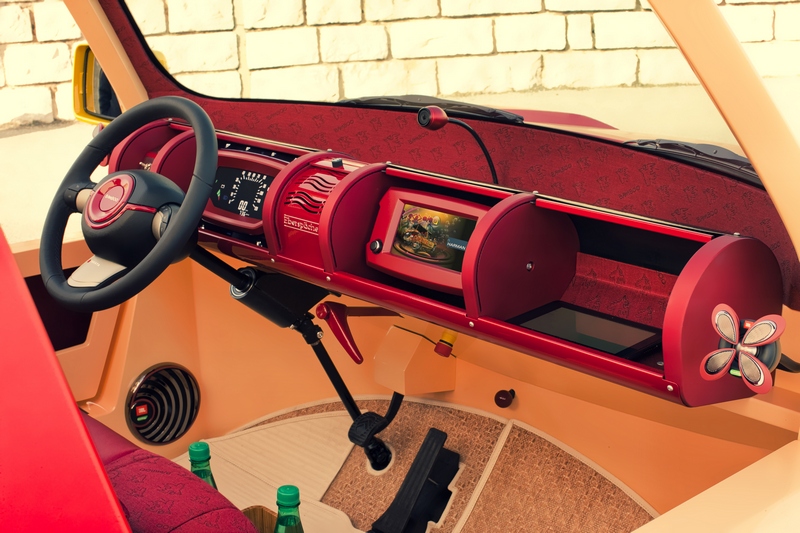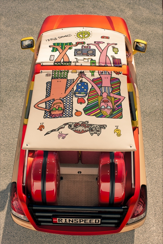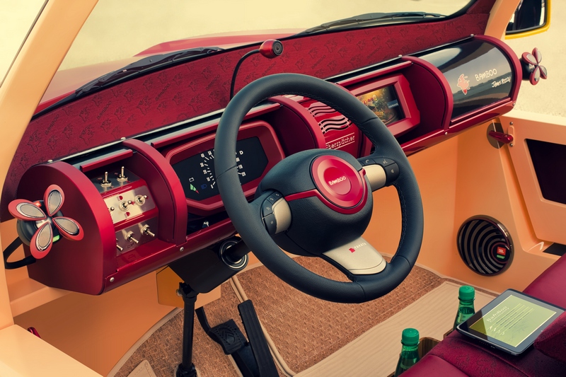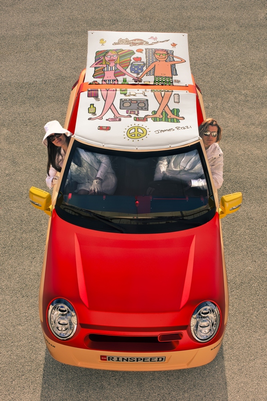 this car irritates. could be that it’s the ingenious crafted creations of world-renowned new york pop artist james rizzi. in any case, frank m. rinderknecht‘s latest work “bamboo” lets the sun rise over the over-engineered metal creatures at the geneva motor show, whose single purpose is to never touch anything other than black asphalt. yes, this is a taste of summer. a taste of beach and sand, of the lightness and lightheartedness of southern latitudes. it is a reminiscence of the seventies, of the south of france, of st. tropez. its colors range from salmon to lobster and yellow, shimmering in the sunlight, staged perfectly by color- and adhesive-repair-specialist (“stickerfix”) akzonobel. and one would expect to find brigitte bardot behind the wheel with playboy gunther sachs at her side heading towards tahiti beach. but at the same time this car points to the future with clever innovations such as a communication display in place of a radiator grille and an inflatable roof that also serves as a beach blanket. yes, this sun & fun car will blow the roof off!