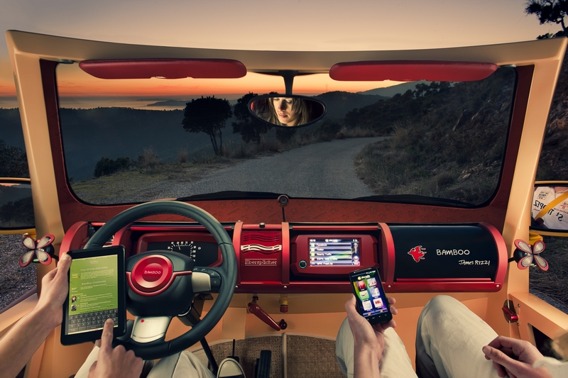 in any case, “bamboo” is the fitting sun & fun car for the extroverted communicator. personal messages for the people in the vicinity of the car are displayed on the innovative “identiface.” this screen-based section, developed by daimler subsidiary mbtech in stuttgart, replaces the radiator grille, which is mostly redundant on an electric vehicle anyways. thanks to its internet connectivity “identiface” can display the occupants’ facebook pages, news from around the world, the manufacturer’s logo or an offer for a ride from a to b. engineering service provider helveting with support from zurich versicherung custom-developed the “bamboo-community” platform. this platform also offers additional practical features centered on social networking, sustainability and optimal driving behavior. in combination with the famous color-changing “rizzi bird“ on the rollover bar (green = i am single; blue = i am in party mood; orange = i need a break) it creates an entirely new automotive form of communication beyond deafening noise attacks. “rizzi bird“ instead of flipping the bird.