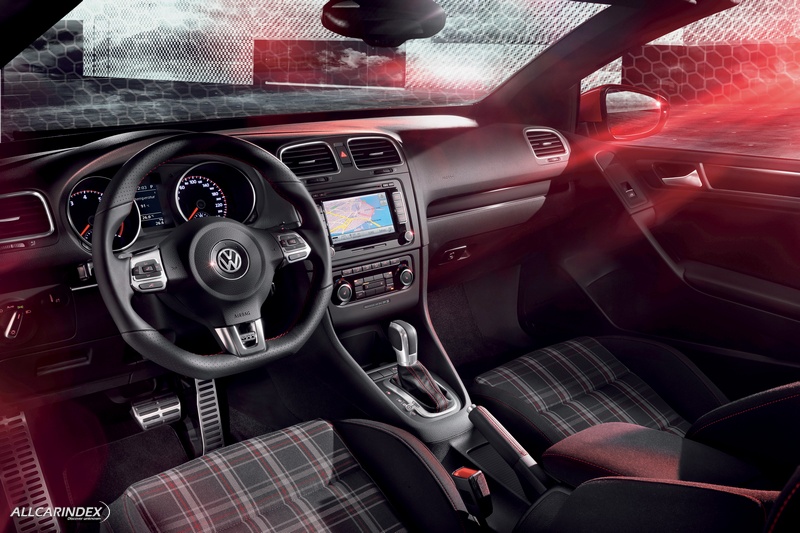 gti interior styling. the interior of the new cabriolet matches that of the classic gti (except for a more raked windscreen frame and special rear bench). it also has sport seats upholstered in the classic and timeless tartan fabric (‘jacky’), and leather seats (‘vienna’) are available as an option. integrated in the seats is a lumbar support, which is activated by a lever on the side of the seat. naturally, this convertible also has pedals with brushed stainless steel caps, and a unique gti gear shift lever in aluminium look; and of course a leather-trimmed steering wheel with grip recesses and a gti emblem; and naturally the steering wheel, gear shift cover and leather trim of the parking brake lever have decorative red seams; and the interior lining of the soft top is black as are the trim covers of the roof pillars. all of these are typical gti features. and so the decorative inlays in the doors and instrument panels are gti-specific as well: in ‘black stripe’ – black, high-gloss accents in metallic look. also standard: automatic climate control (climatronic), chrome surrounds (e.g. around switches for the lights, electric windows, mirrors) and the rcd 210 radio-cd system.