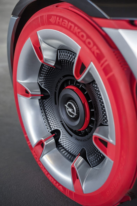 the gt concept once again showcases opel’s pioneering spirit. a dynamic driving machine something that is already symbolized by the red signature line that splits the vehicle body horizontally and proportions it. the distinctive red front tires – mounted on rims with a cheeky roller skates design – are reminiscent of the opel motorbike motoclub 500 that was also avant-garde at its time and was the proud owner of two red tires in 1928. apart from that, the gt concept does not have many links to the past. the long bonnet, the absence of a trunk lid, the central dual exhaust and of course, the name all refer to the original gt. apart from that the opel gt concept is independent with no sign of retro-design.