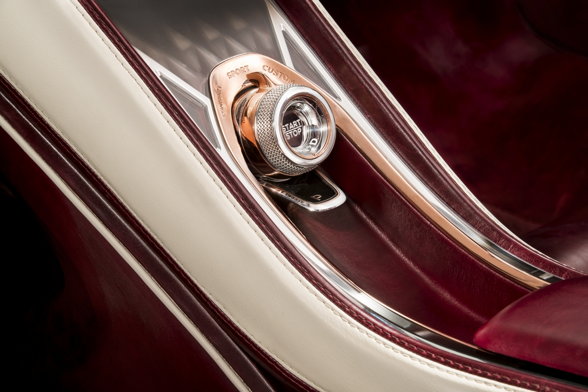 Exquisite copper elements around the gear selector, Bentley Dynamic Drive dial and in the door veneer panels are integrated into the cabin to highlight the electric performance potential of the concept’s advanced new powertrain.