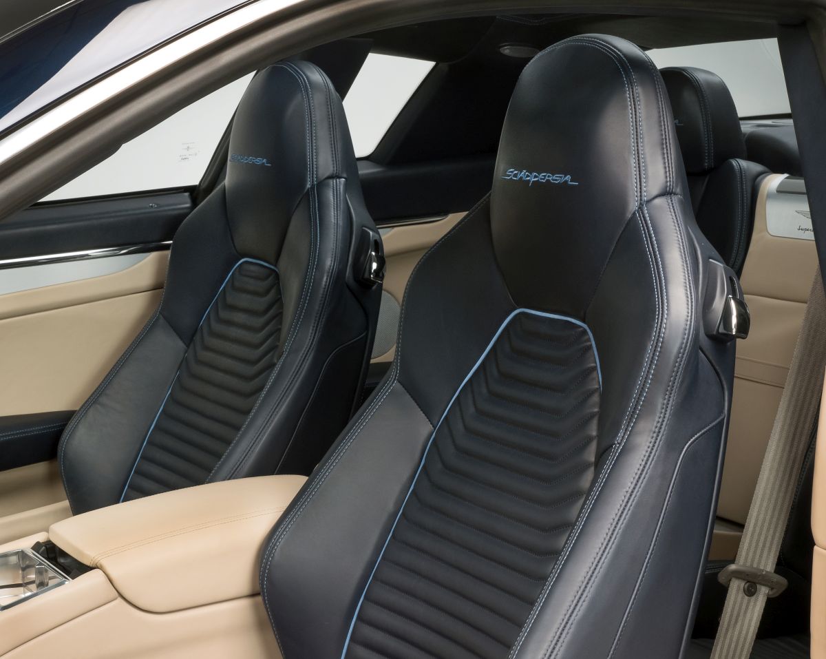 Touring used the finest hides from Foglizzo, supplier of bespoke luxury leather for unique cars since 1921 for the interior. The care for details went as far as to develop a special aroma, which Foglizzo reserves for Touring customers. The exterior's deep blue is matched by the seats, which are then highlighted with contrasting piping and stitching, while the centre of the headrest displays the Sciàdipersia name, carefully embroidered by hand. Delicate, lighter shades of natural colours are used to offset the darker colours of the seats.