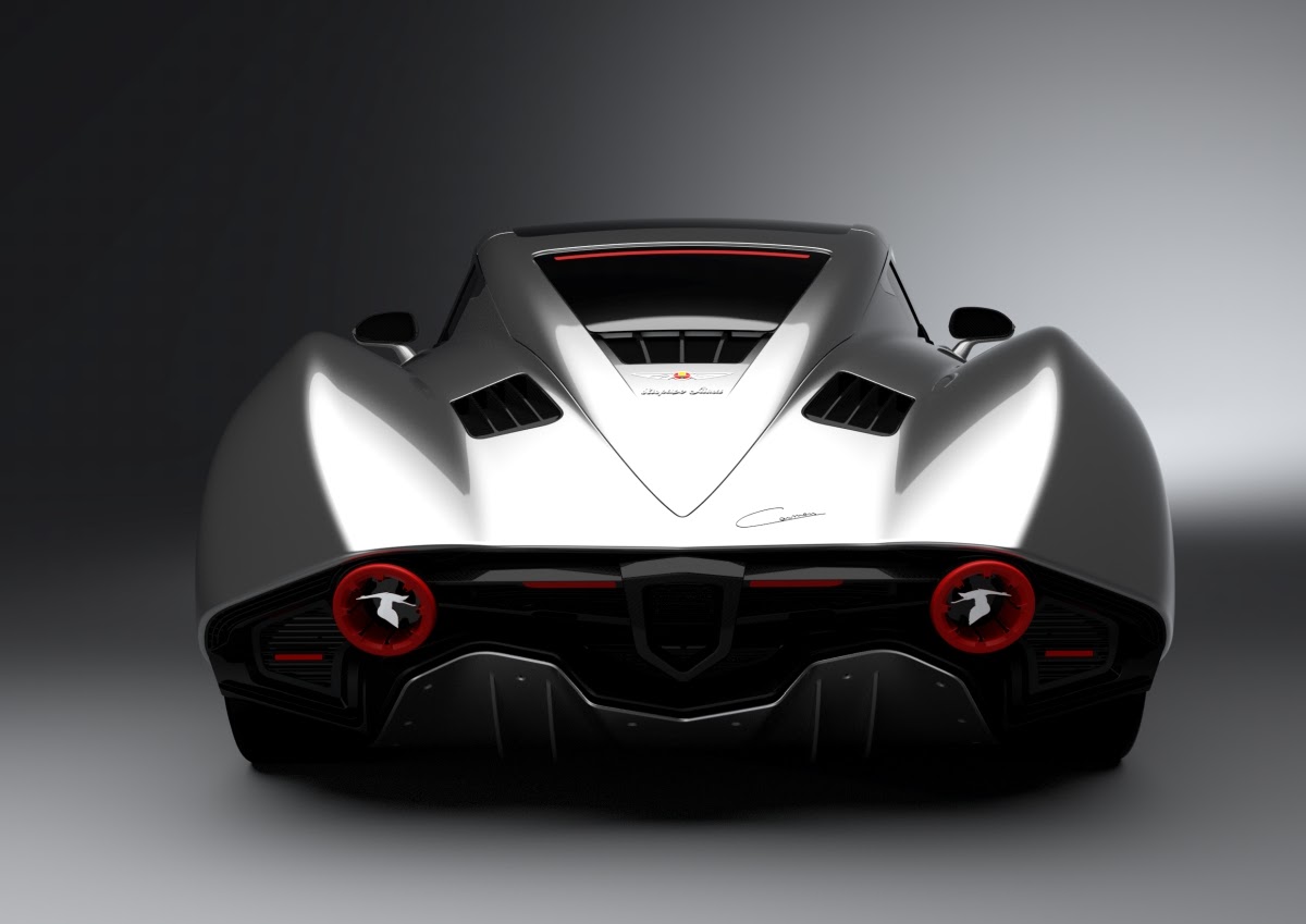 Viewed from the rear, the taught haunches that arch over the covered rear wheels taper slightly, flanking a dramatic narrowing of the roofline and rear screen that ends in a distinctive, sharp, rear-facing point – the trailing tail of the teardrop. The model name is displayed proudly at the clean straight lip of the rear deck panel: ‘Carmen’ is presented in script, a direct representation of Carmen Mateu’s signature.