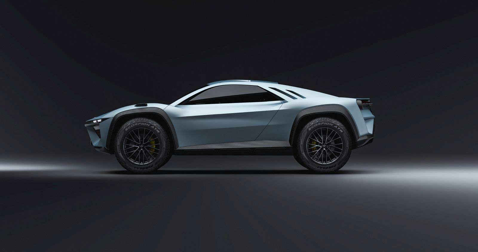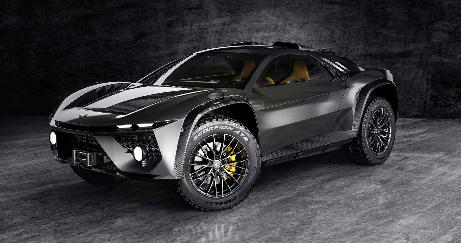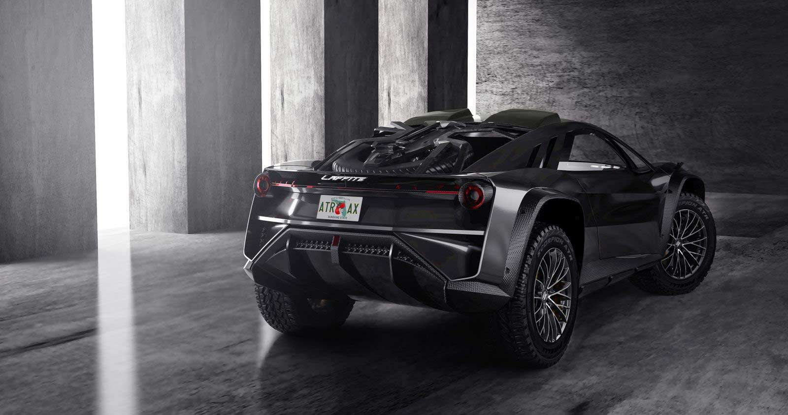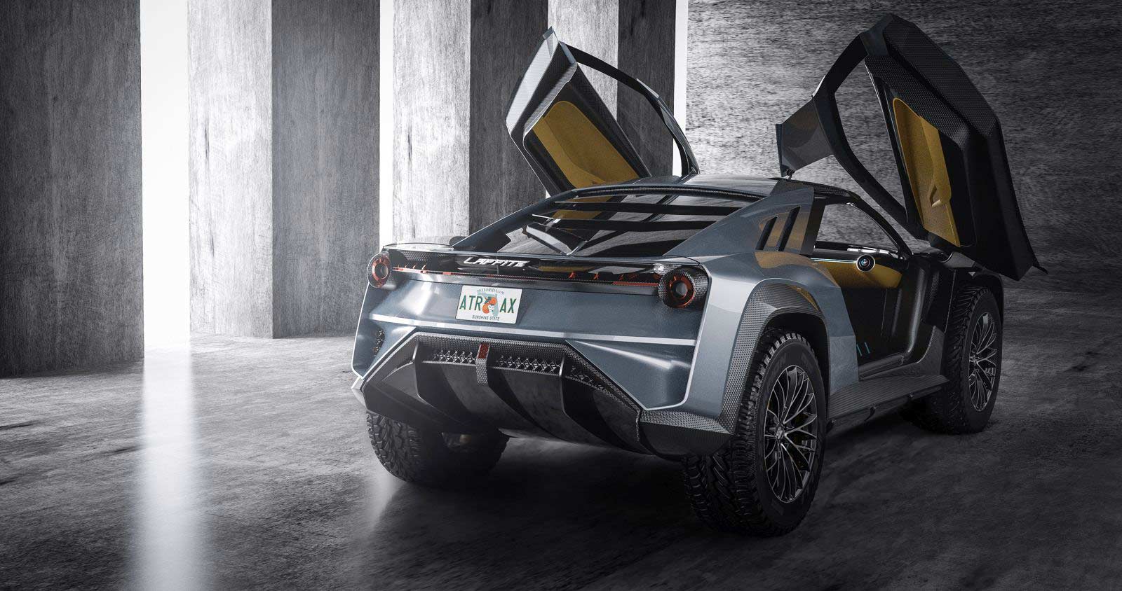 The ATRAX and ATRAX STRADALE were designed as sporty SUVs with generous volumes and spacious interiors. The ATRAX features exceptional and extreme shapes, all-terrain wheels almost a meter in diameter, imposing fenders, and stylish, exposed carbon wheel arches. The ATRAX Stradale, on the other hand, features streamlined wings and accommodates a spacious trunk. Both models feature an end wing integrated into the fenders, while a red strip of lights separates the sport-derived round tail clusters. The ATRAX has an exterior spare wheel supported by a spider-like structure, which doubles as a hydraulic system that can lift the large spare wheel, while the ATRAX Stradale has a rear with streamlined wings.