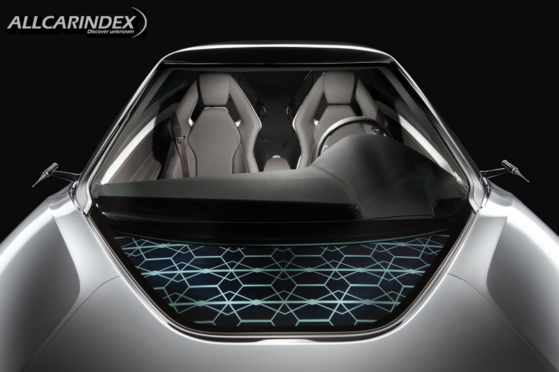 the inspiration derived from airplanes does not end there. in the interior, the floating dashboard and center console are inspired by fighter jets’ slick yet sophisticated design. the design of the seats and door panels express the same balance as the exterior design, mixing stretched flowing shapes with dramatic dynamic graphics. the driver display provides driving direction in the center with other driving information (concerning mainly speed and autonomy) on either side. rear view cameras combined with the radio and gps antennas on each side of the car provide an image which is displayed in the center of the dashboard.