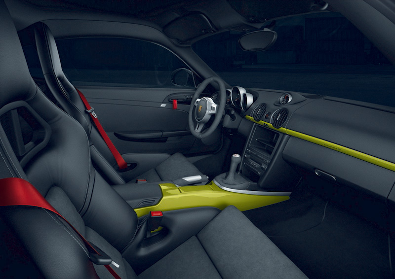 The Cayman R's purpose and purist character can be seen at first glance. The extended silhouette of the bodywork, which has been lowered by 20 millimetres (0.79 in) compared to the Cayman S, combined with the distinctive fixed rear spoiler, the high-quality silver-painted wheels and numerous sporting highlights on both the interior and exterior, ensures an individual appearance. The black-framed headlights, black exterior mirrors and the "PORSCHE" lettering on the side – in contrasting black or silver, depending on the body colour – take design cues from classic Porsche racing cars.
