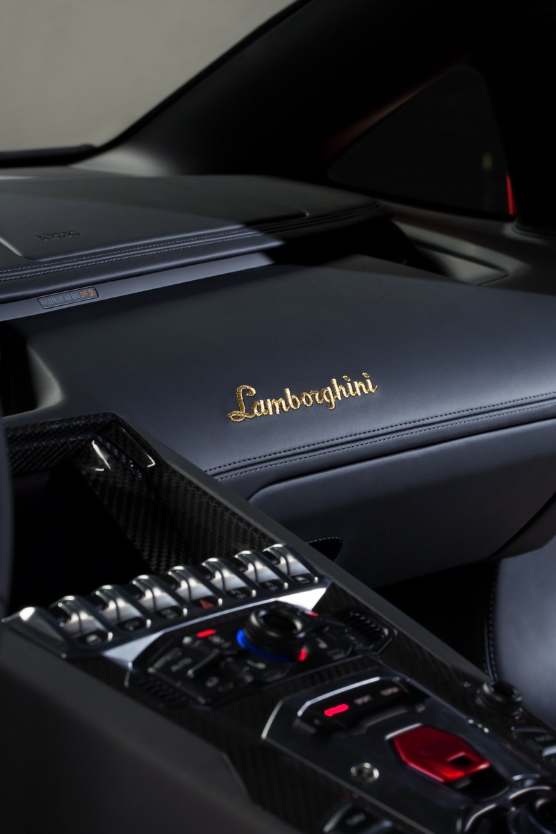 two internal color options are offered, in full nero ade or terra emilia leather with tone-on-tone stitching and carbon fiber package as standard. the miura 50th logo is stitched into the upper part of the seats in gold or silver to reflect the car’s livery, and the ‘lamborghini’ lettering embroidered on the leather dashboard.
