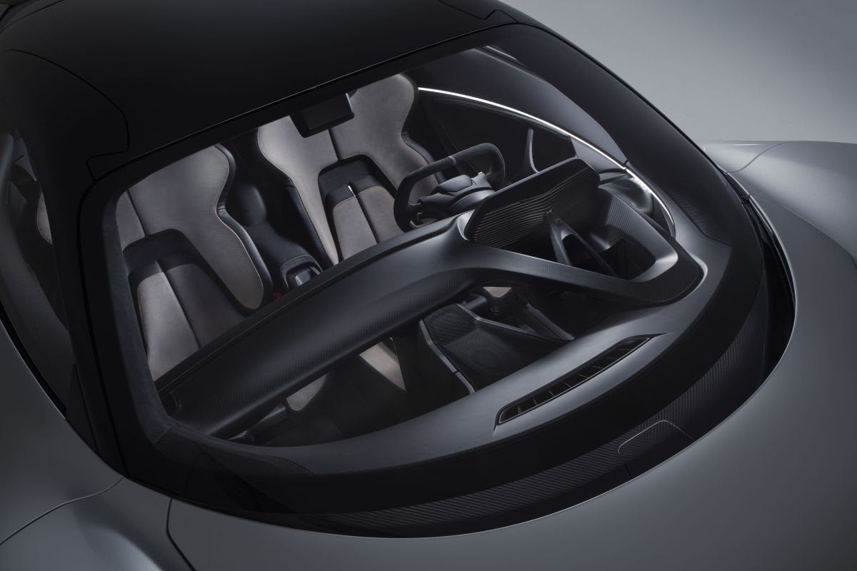 The battery pack is mounted centrally behind the passenger compartment, and its cover is visible through the glass rear screen. This positioning delivers significant advantages in terms of styling, aerodynamics, packaging, weight distribution, occupant comfort and dynamic handling. It also supports fast and convenient servicing and maintenance. Furthermore, the set-up has been designed so that in the future alternative battery packs – for example, to optimise track performance – can be easily installed.