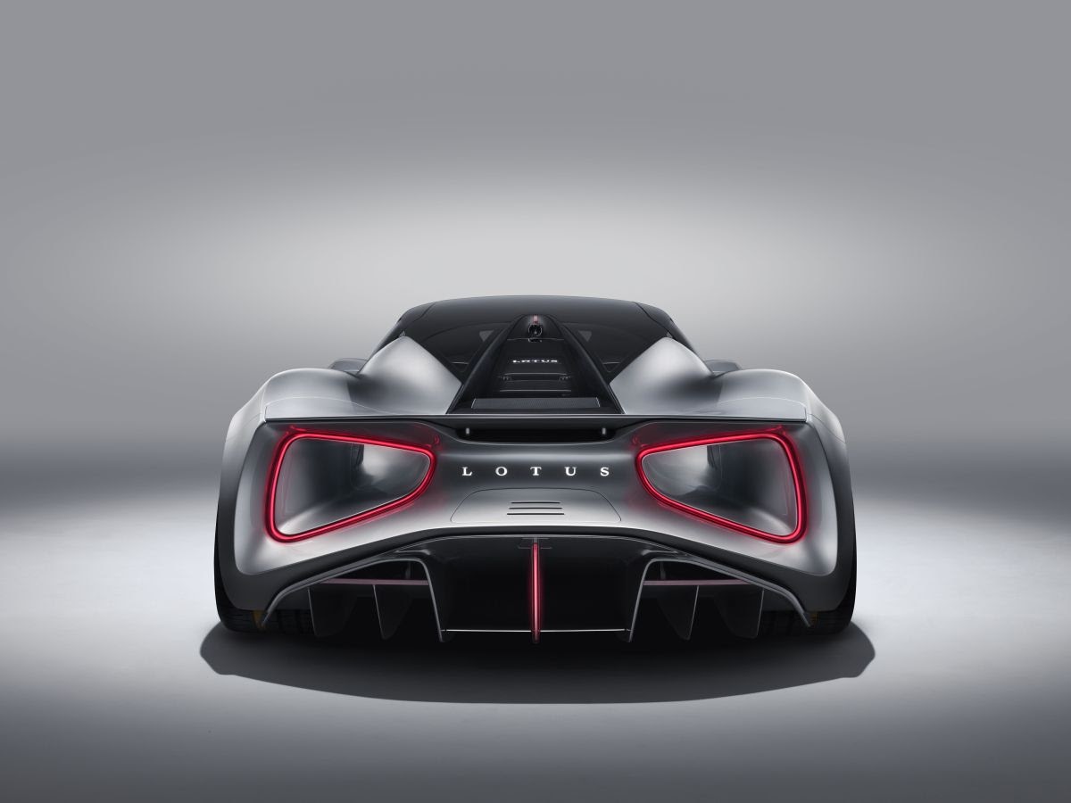 The directional indicators are incorporated into the corners of the ribbon, while the reversing light is provided by the illuminated ‘T’ of the ‘LOTUS’ wordmark above the integrated charging flap.