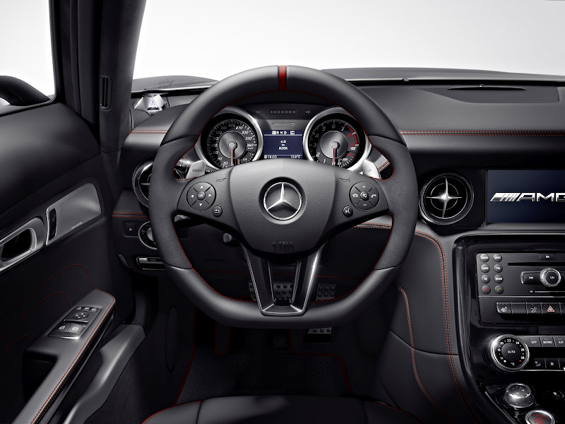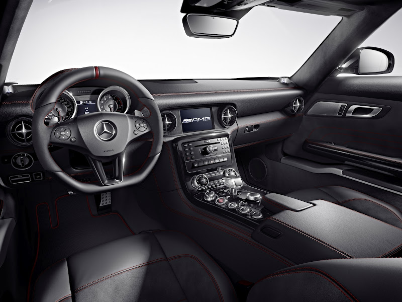 the interior too features a consistently sporty design: the sls amg gt combines the high-quality, exclusive ambience of a true amg model with the functional atmosphere of a racing car. the sports seats not only have an embossed badge on the head restraints, but the centre sections are also finished in alcantara ® . continuing the theme, alcantara ® is also found on the door centre panels. the black interior appointments are combined with red seat belts, plus all of the contrasting stitching on the amg sports seats, the centre console and the door panel lining is finished in red too. the floor mats also feature red edging.