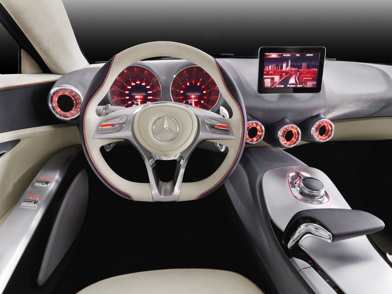 a smartphone is fully integrated into the operating concept of the concept a-class. all the applications, services and features of a digital lifestyle can therefore be operated via comand online. the visual presentation of the display screen elements is unique and revolutionary. dynamically varied glass elements are illuminated by magenta-coloured light to form three-dimensionally arranged navigation levels.