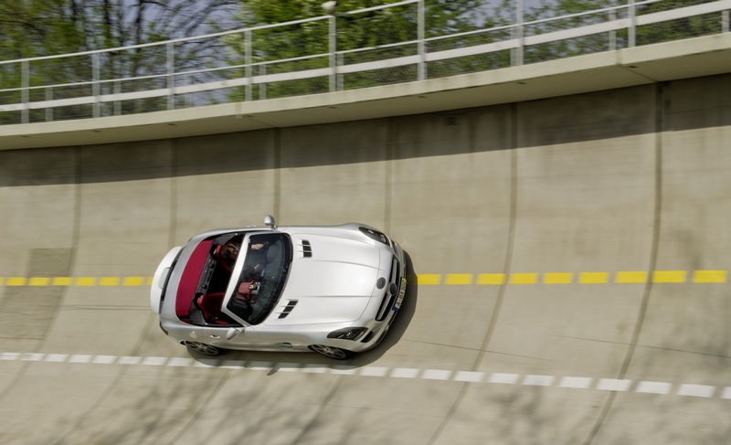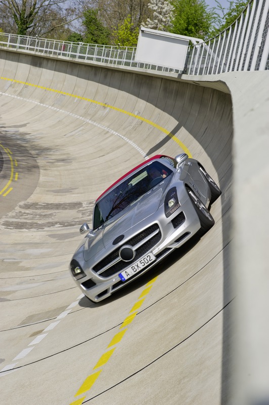 the three-layered fabric soft top of the sls amg roadster, which is deposited behind the seats in a z-formation to save space, is also an aspect relevant to handling dynamics. this weight-optimised, combined magnesium/steel/ aluminium construction ensures a low centre of gravity and is designed for speeds up to the maximum of 317 km/h (electronically limited). whether open or closed, even at top speed there must be no intrusive flapping, booming, hissing, clattering, whistling or howling. likewise the push-on glass draught-stop and the panelling in the interior, on the soft top and along the beltline must be vibration-free. nothing must be allowed to compromise the open-air enjoyment. the basis for verified, customer-compatible results in extreme conditions is provided by precisely defined test drives on the high-speed tracks in papenburg, nardo (italy) and idiada (spain).