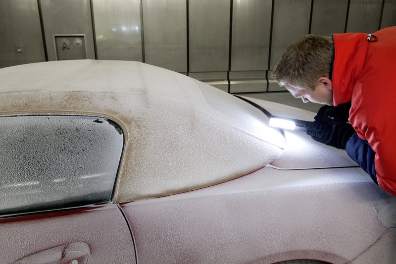 whether during the hose test, when all soft top, door and flap seals are sprayed with a water-hose, the continuous, overnight rain test, the fording test, the icing, swirl and high-pressure tests, or the final session in an automatic car wash – the rain test simulates every conceivable situation that can occur on any continent.