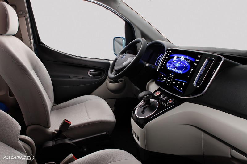 inside, the nissan e-nv200 concept interior depicts a clean, modern nissan ev identity through use of the ev meters, blue colored accents and bright interior color palette, while also retaining the nv200’s strong functional feeling. the e-nv200 concept interior also features advanced telematics and a flat c-cluster display that resembles and responds to user input like a tablet computer.