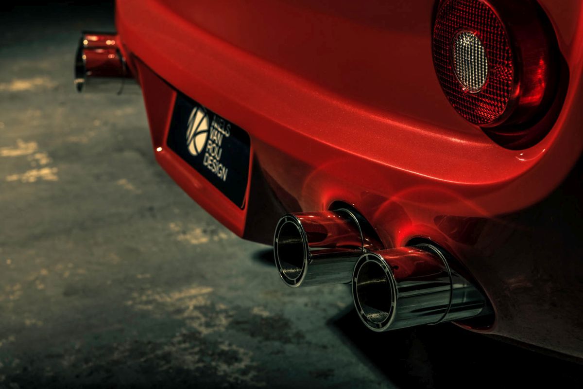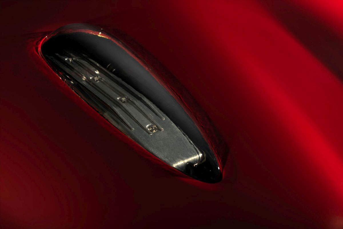 Van Roij: "A car is a complex, three dimensional sculpture, which has to look right from all angles and under different light circumstances. Like sketching, the clay modelling process is iterative and the Breadvan Hommage was reshaped many times, to get it spot on. After establishing the correct proportions the search for sophistication in the surfacing, or skin, started: finding the right subtleties for transitions from one element to another. It includes the exterior graphics like the richly sculpted air vents on the front fenders. The body of the Breadvan Hommage was hand beaten by coachbuilder Bas van Roomen. Bas also worked on the clay model of the Breadvan Hommage. Only the windscreen of that car remained OEM and it was painted in one of the eight specially designed reds.