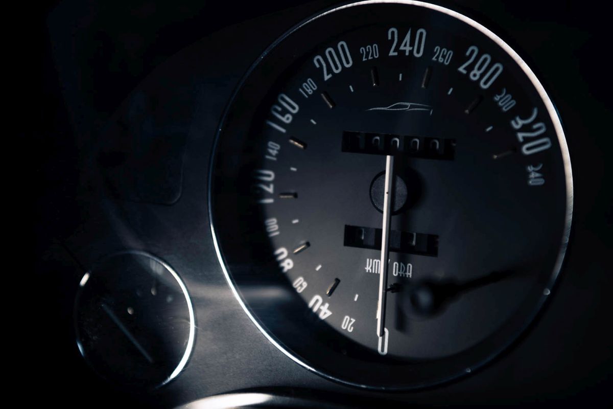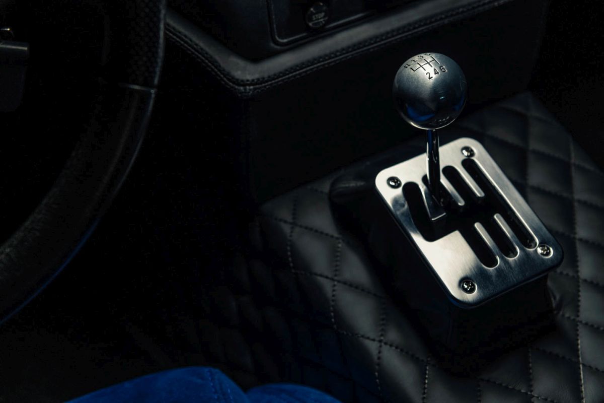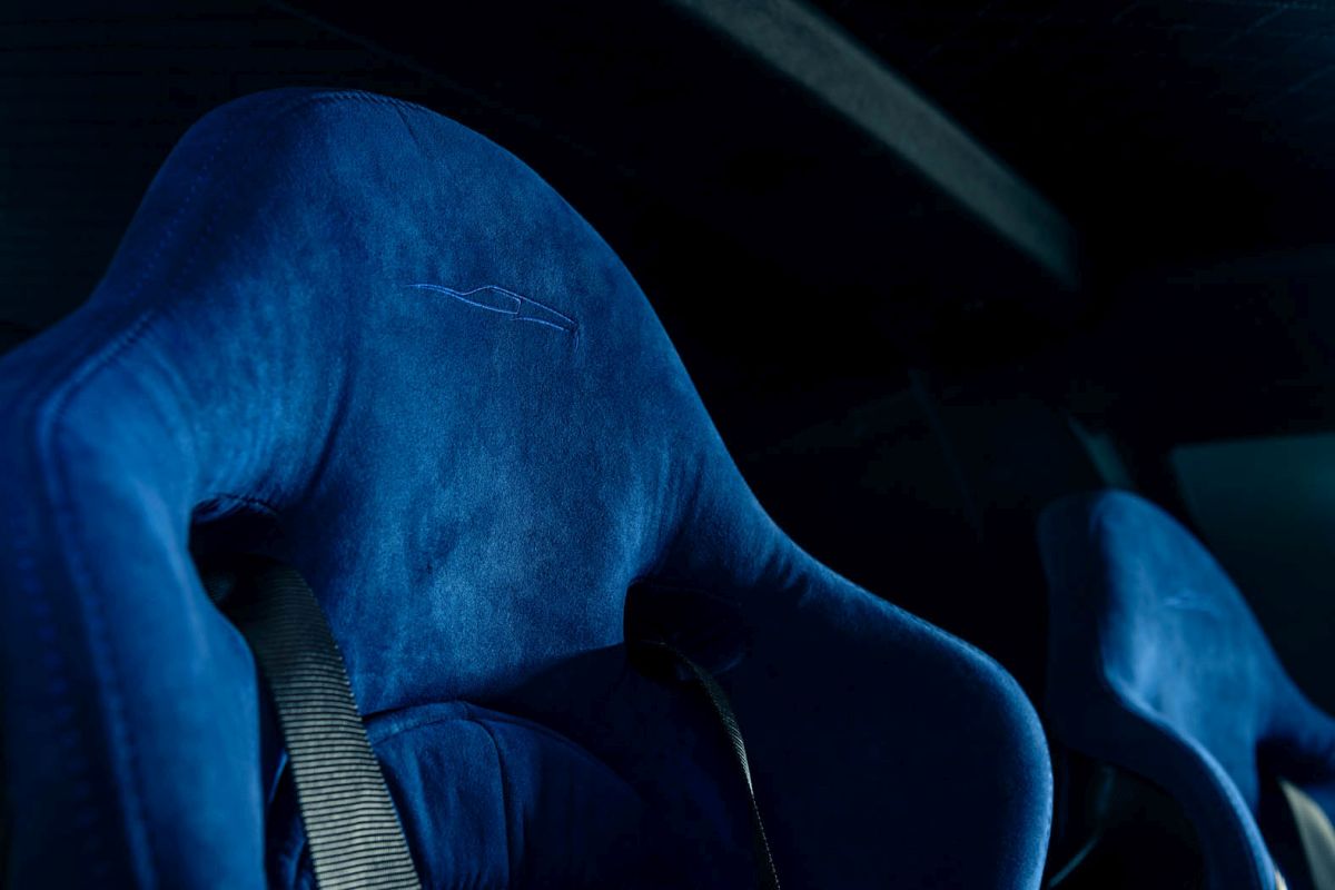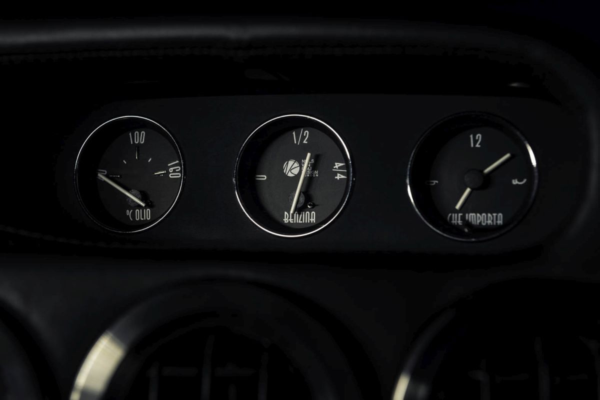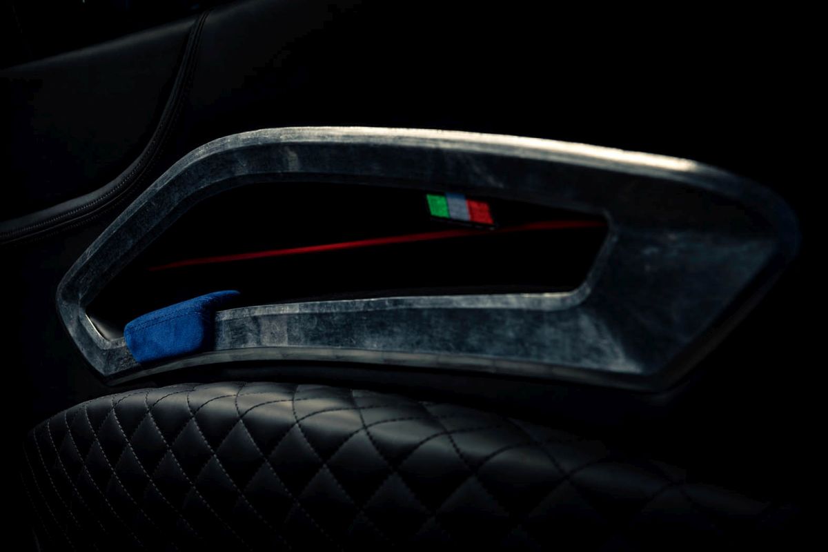 The Breadvan Hommage features a handmade interior. The iconic outline of the exterior design has been embroidered into the blue Alcantara carbon fibre backed seats. The monogram can also be found on the dials, all 7 boasting pure silver inlays. The clock says: 'che importa'. Italian for 'who cares!' All switchgear is made out of milled aluminium, linking to the gated shifter, which is set on a raised block. The driver is surrounded by quilted black leather: it can be found on the centre console, the lower door cards and the headliner. The door panels feature an unpainted, hand beaten aluminium element, which links to the custom body, made in the exact same way. A small embroidered Italian flag in the corner of the aluminium insert is highlighting the roots of the vehicle. The door is opened through pulling a lightweight red cord, whilst a blue Alcantara insert functions as grab handle to close it.