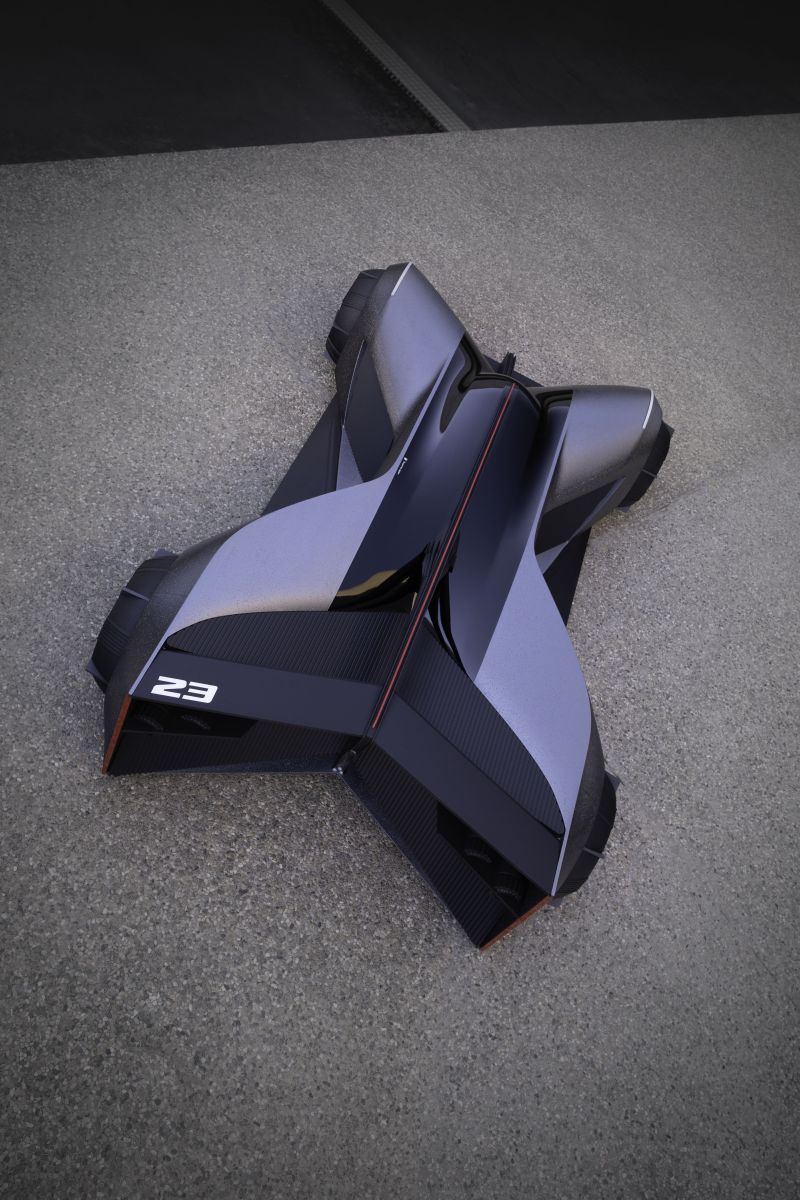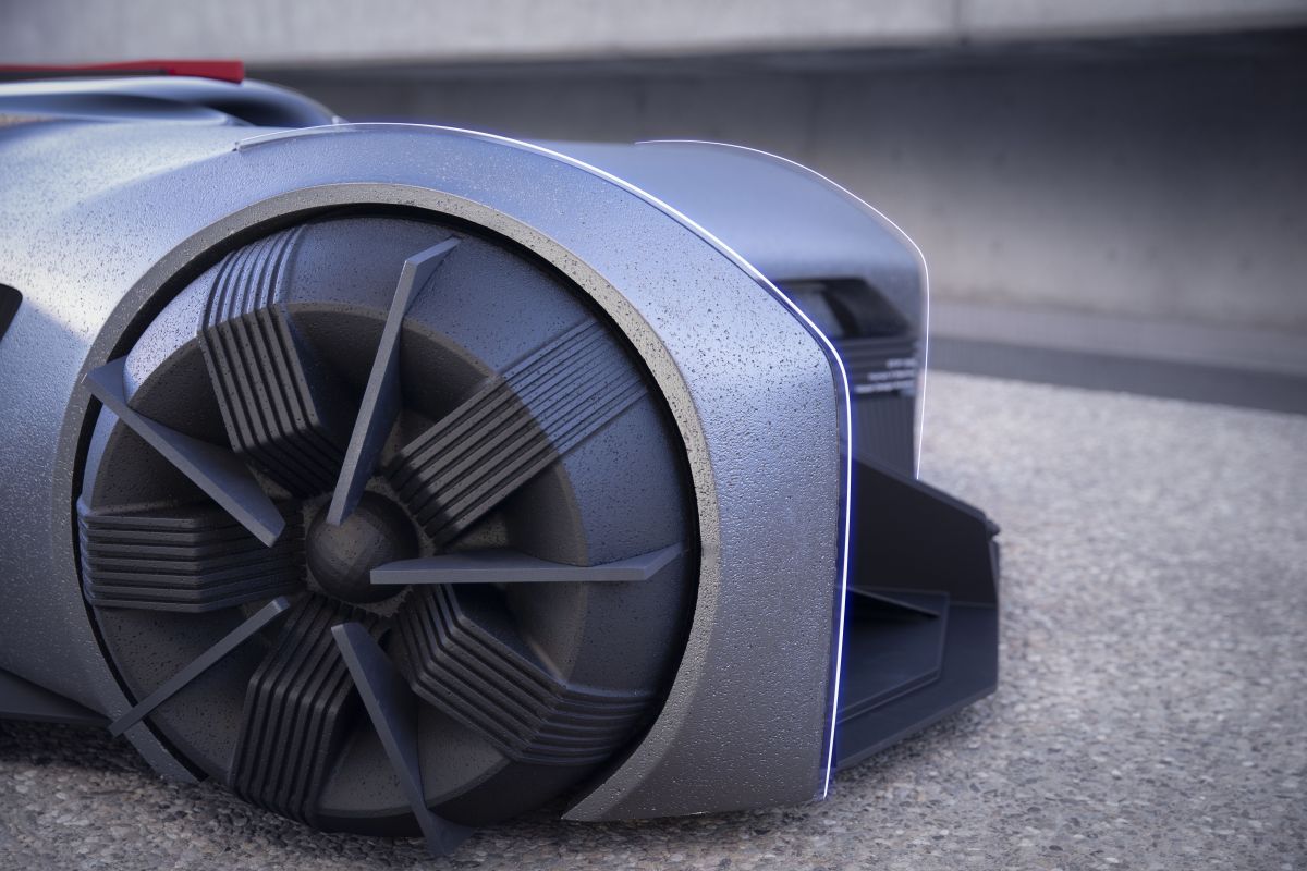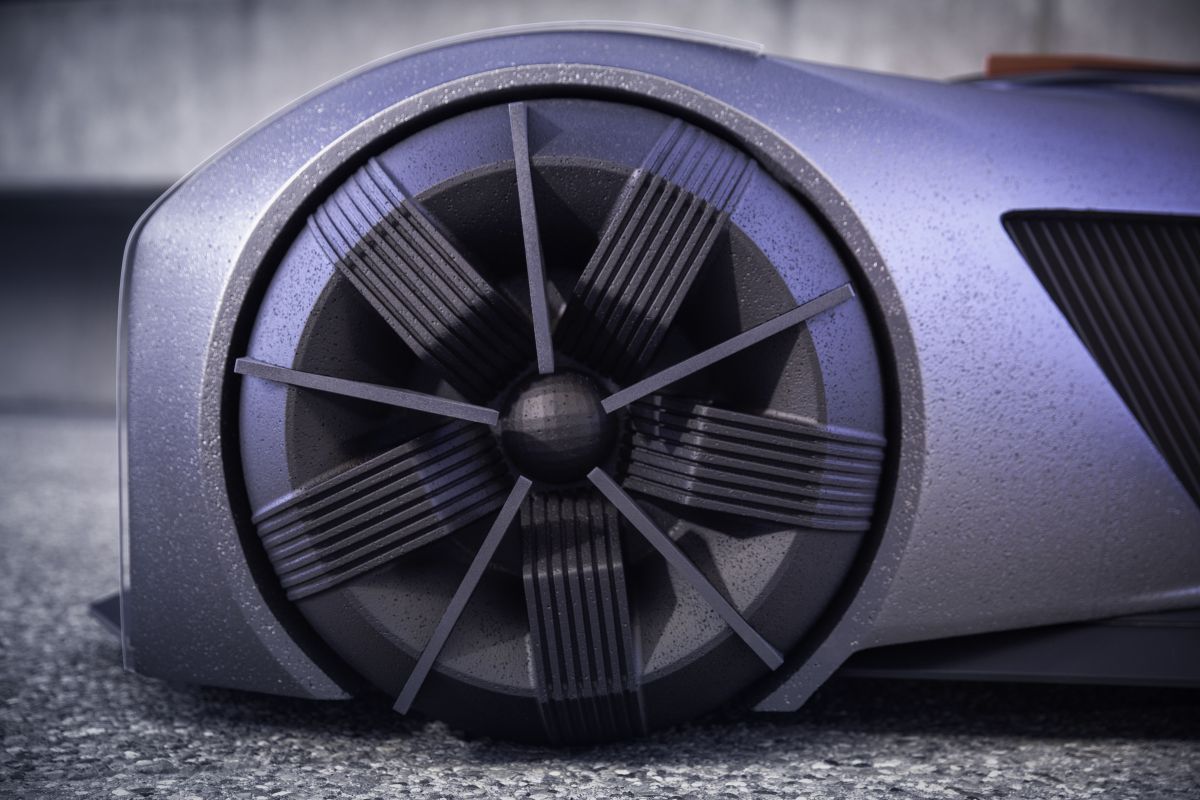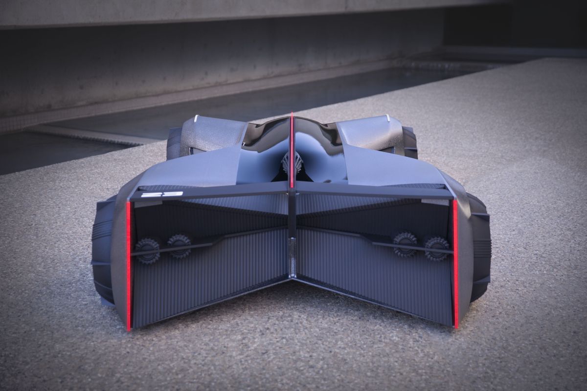 As a vehicle that would be 'driven', most likely at night, maneuverability would be a critical part of its high-power electric performance. Choi imagines the vehicle's one-piece wheel/tire units as having a shape close to square, allowing the vehicle to turn 360 degrees. The outer tire diameter measures 21 inches and inner wheel circle is 15 inches. The wheels' spoke pattern was designed to help the wheel cool down fast, even under extreme braking.