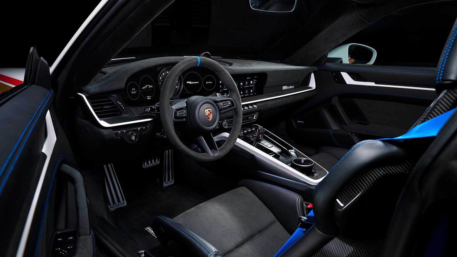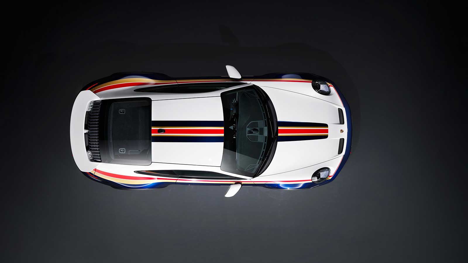 At the heart of the optional Rallye Design Package from Porsche Exclusive Manufaktur is a two-tone paint finish in White/Gentian Blue Metallic. This is the first time that Porsche has implemented the combination of bi-colour paint and decorative foiling in series production. On the side of the vehicle, the customer can choose an individual race number between 0 and 999.
