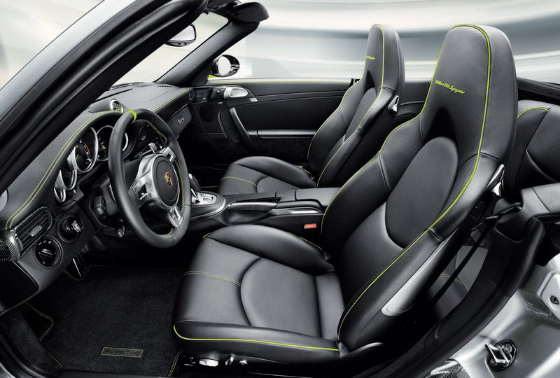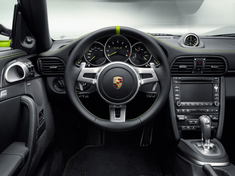 To shorten the time the customer has to wait for the 918 Spyder, Porsche is offering everyone placing an order the exclusive opportunity to acquire a 911 Turbo S “Edition 918 Spyder”, also limited to no more than 918 units. Visually, both inside and out, the special edition is inspired by the 918 Spyder's characteristic individual features. That includes the distinctive acid green features such as the specific and part-embroidered model logos and seams, the instrument cluster needles, the specific PCM screen and illuminated door entry guards. The limited edition badge on the glove compartment lid bears the same number as the 918 Spyder the customer has ordered. The 911 Turbo S “Edition 918 Spyder” can also be ordered in the same colour.
