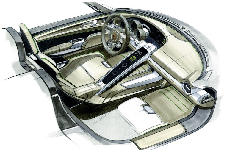 The design’s DNA is derived from the Carrera GT and Porsche 917 sports car as well as the RS Spyder and is very closely modelled on the 2010 concept car. Unlike the concept car, however, the production version of the two-seater, based on a carbon fibre-reinforced plastic monocoque, features a manual roof system with removable roof panels that can be stowed in the front luggage compartment.
