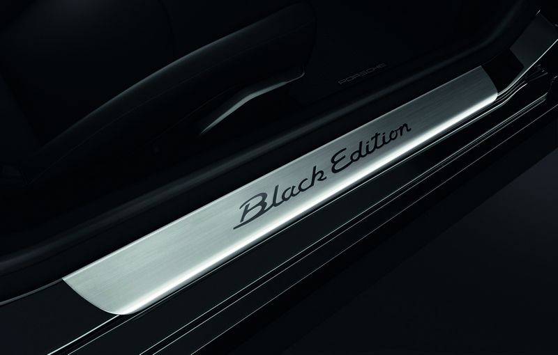 The "Black Edition’s" black lettering on the stainless steel door entry guards provides a first hint of the high-quality interior design concentrating on purist sports car values.The interior continues the exterior colour scheme. Already equipped as standard with high-quality partial leather seats, the 911 Black Edition can of course be upgraded with the option of an additional leather interior. Also included in the series version is a sports design steering wheel. The instrument cluster naturally remains in black. On the glove compartment lid, a badge testifies to the 911 Black Edition's limited production run. Conversely, the decorative moulding on the dashboard, gear lever or selector and air vents provide a contrast with their aluminium look paint. The rear centre console is painted in the exterior colour.