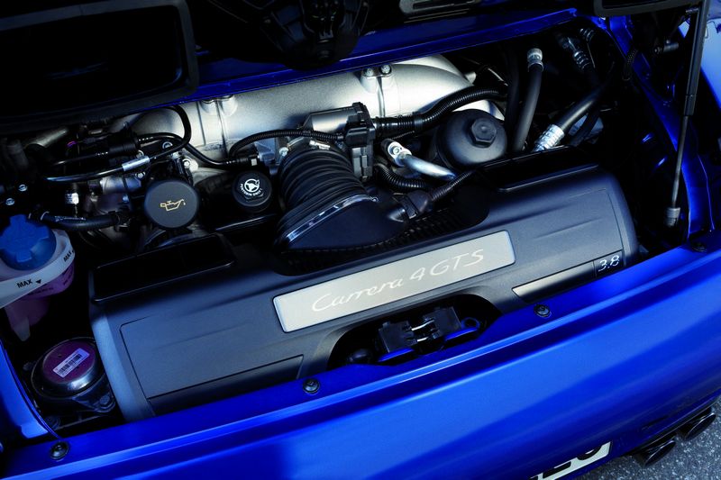 the 911 carrera 4 gts power unit has its origins in the 3.8-litre, six-cylinder carrera s engine. a wholesale revamping of the intake duct added 23 hp (17 kw), taking the power output to 408 hp (300 kw) at 7,300 rpm. the special aspiration system not only improves peak power output but flexibility and power development as well thanks to a more generous torque curve in the lower and middle engine speed range. 320 newton metres kick in from as low as 1,500 rpm; the six-cylinder engine delivers its rated torque of 420 nm in the broad engine speed range from 4,200 rpm and 5,600 rpm. the sports exhaust system fitted as standard ensures a distinctly sporty sound. it invests the new carrera 4 gts with an unmistakable acoustic signature and the rear view of its tail pipe with its unique black surface design lends it a unique character.