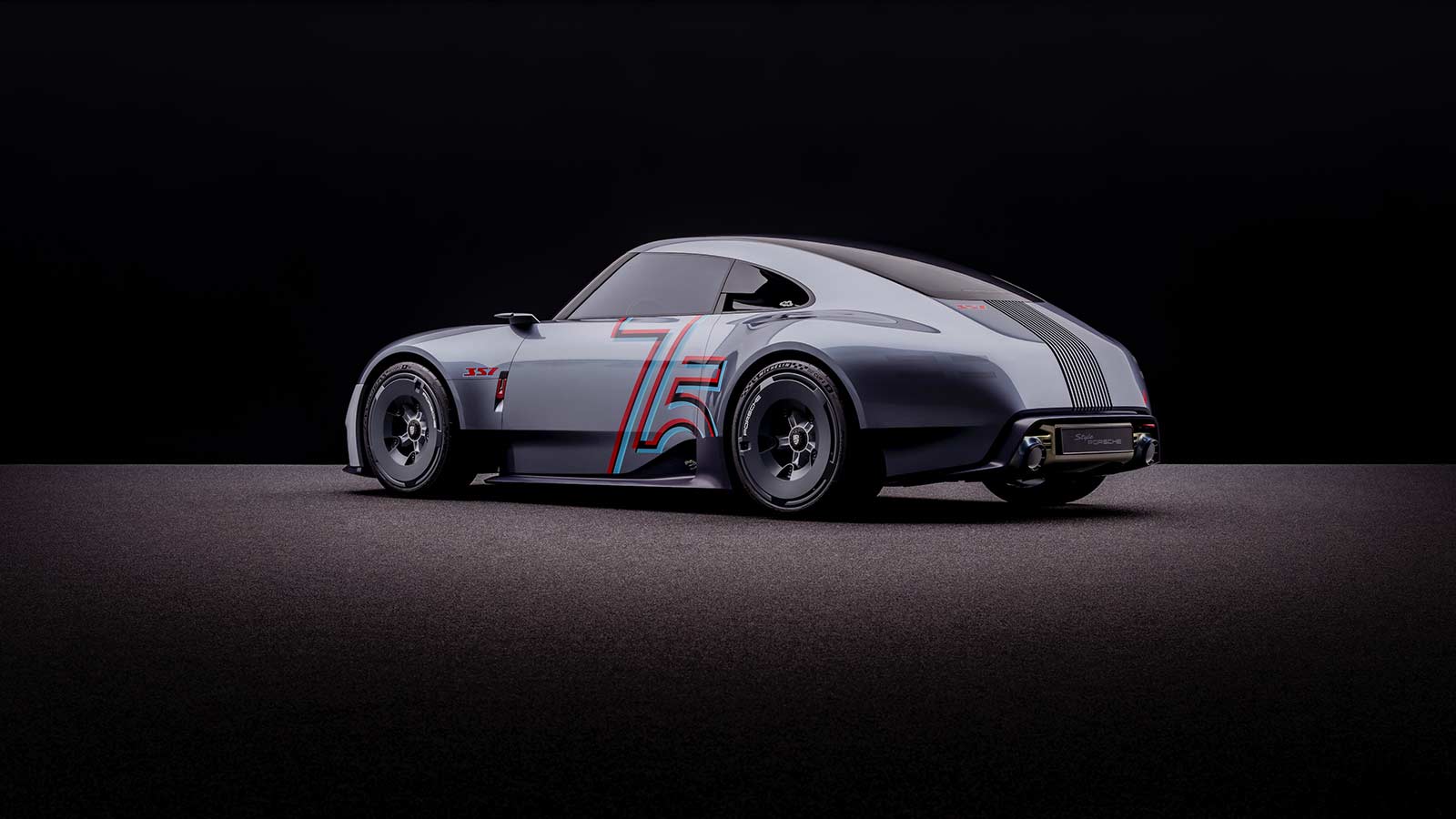 The “75” anniversary logo adorns the doors and the front of the design study like a start number. And that is far from the only detail from the world of racing: there’s nothing behind the lower area of the front wheels, which allows better ventilation of the wheel arches. The wrap-around, jointless front bonnet is fastened with quick-release mechanisms. Threaded rods stabilise the large front spoiler. On the side sills, the Porsche designers employed natural fibre-reinforced plastic (NFRP) – as in the Porsche Mission R, the concept study for an all-electric GT racing car presented in 2021. The basis for the sustainable materials is provided by flax fibres from agriculture. Instead of traditional exterior mirrors, the design study is equipped with cameras on the edge of the roof. The visible tailpipe trim in the rear is made of a blueish-looking titanium, while the inside of the tailpipe is made of ceramic.
