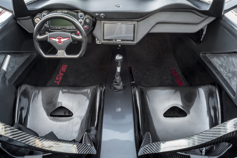 In an age where many supercars rely on electronic aids, the Beast gives control back to the driver. Using a 2.4-liter 4-cylinder engine featuring a crank-driven Rotrex supercharger and turbocharger, and a manual gearbox (optional sequential automatic), Beast sends 500 horsepower to the rear wheels.
