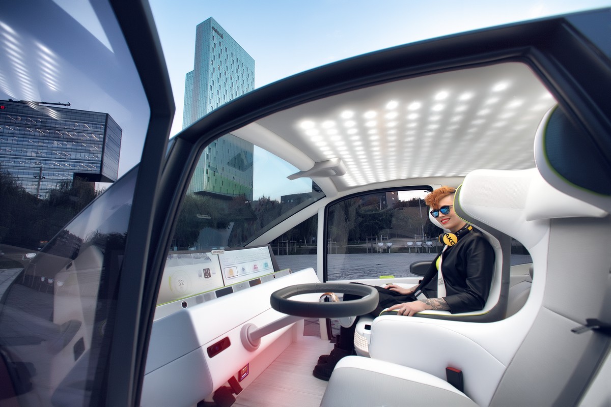 the windscreen serves as a giant display for virtual and augmented realities. holographic laser projection technology developed by wayray allowed to make area covered by displays significantly larger than in conventional head-up display used today. us company techniplas, a specialist for cognitive and networked products, developed the multi-functional rear window. it integrates not only the usual lights at the back of a car; it also serves as a display panel for the integrated clever micro delivery box. it can even be cooled or heated as needed. as a special touch, the box was sized to fit a power bank form eva fahrzeugtechnik, which increases the range of the “oasis” when circumstances demand.
