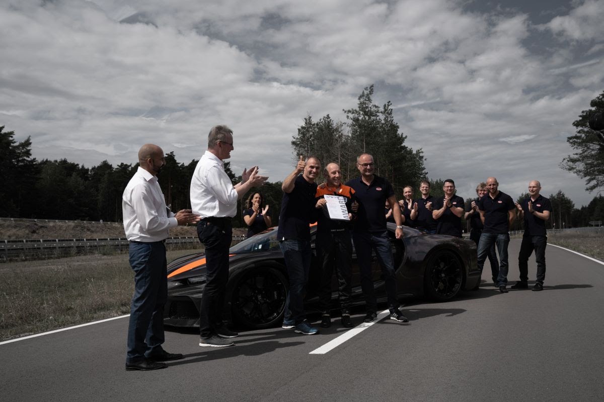 The record run was recorded by a sealed GPS box, the certificate was issued by SGS-TÜV Saar. So as of August 2019, Bugatti is the first manufacturer to produce a car that runs faster than 300 mph – at a speed of 304.773 mph.