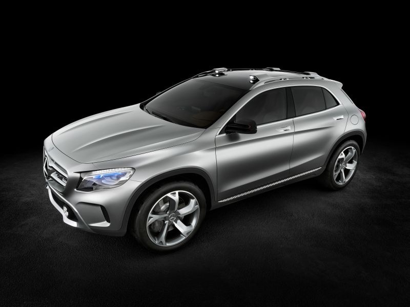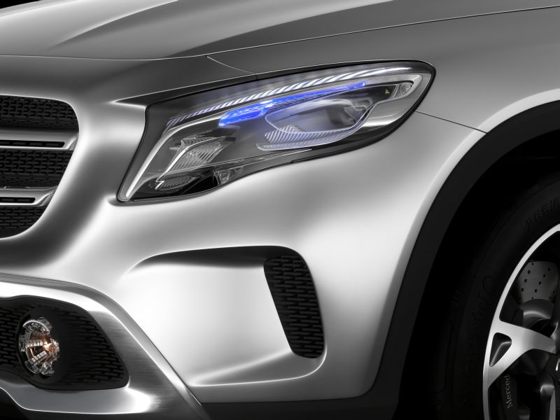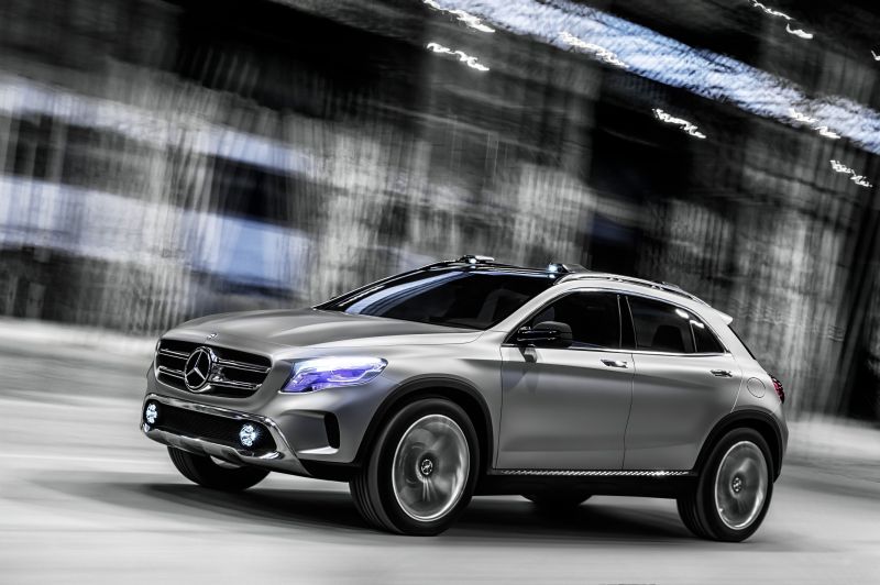 mercedes-benz will be showing a compact premium-class suv at the "auto shanghai" motor show (21 to 29 april 2013) in the form of its concept gla. the concept gla combines dynamic styling with clear benefits for recreational use. under the bonnet of this new concept vehicle (length/width/height: 4383/1978/1579 millimetres) sits a four-cylinder turbocharged petrol engine rated at 155 kw (211 hp) with a displacement of 1991 cc. its power is transmitted to the road via the 7g-dct dual clutch automatic transmission and 4matic all-wheel drive. a new approach is taken here in the form of headlamps featuring laser technology: these not only shine more light on the road, but also function as projectors.
