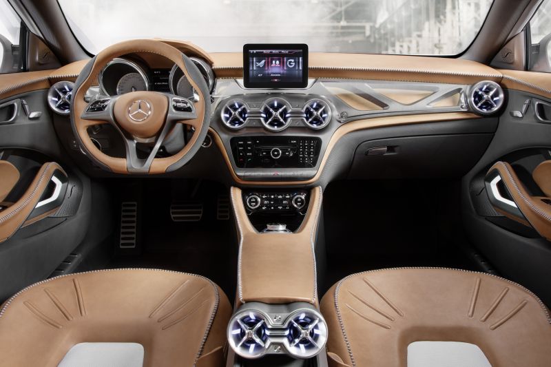 in terms of its design, the interior reflects a clear alignment with the interiors of the other new compact mercedes models, reinterpreted here for a sophisticated and exceptionally high-quality suv. it is dominated by an exciting juxtaposition of leather and dark galvanised aluminium. the four individual seats and the door centre panels are upholstered in natural leather in a rich shade of brown. both colour and workmanship bring the image of a saddle to mind: all in all, the concept gla incorporates more than 20 metres of hand-stitched seams to hold the raw edges of the leather together. the seat cushions, which feature central inlay panels in a high-quality canvas material, display an embossed pattern that continues the saddle theme. an illuminated insert is set into the integrated head restraint of each of the four sports seats.