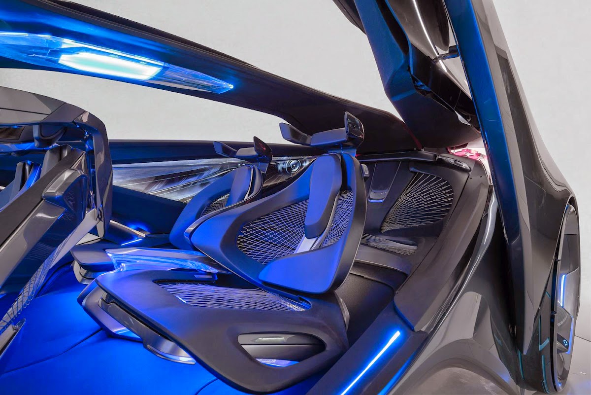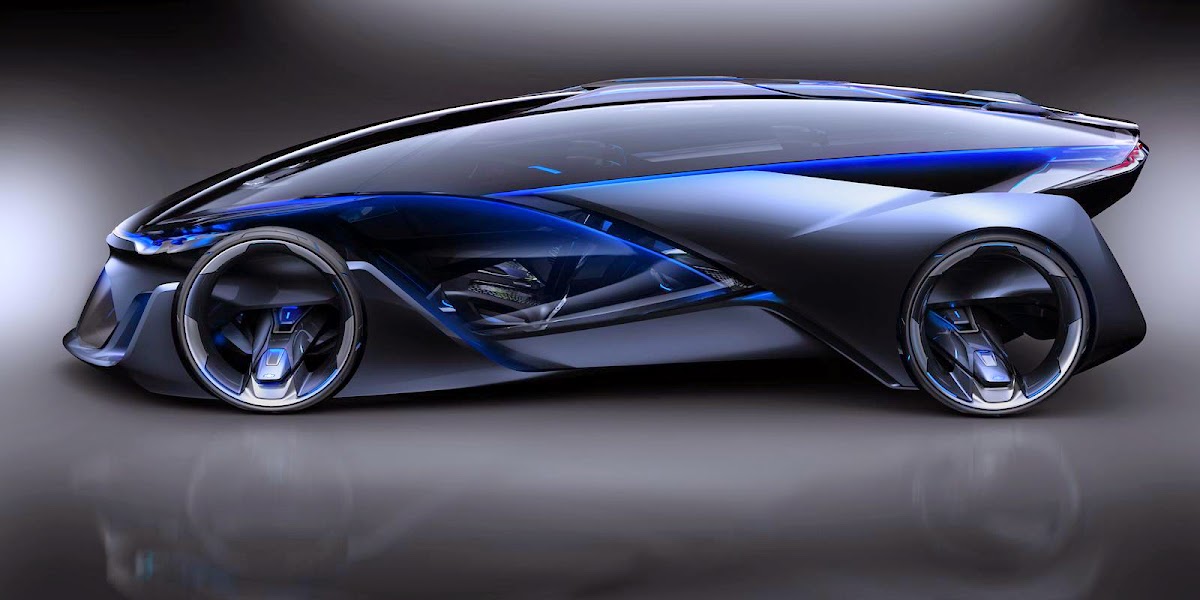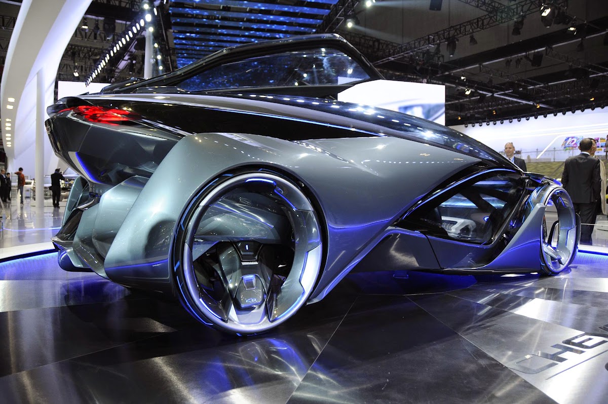 the chevrolet-fnr boasts a futuristic capsule design. it has crystal laser headlights and taillights, dragonfly dual swing doors, magnetic hubless wheel electric motors and a wireless auto-charge system.