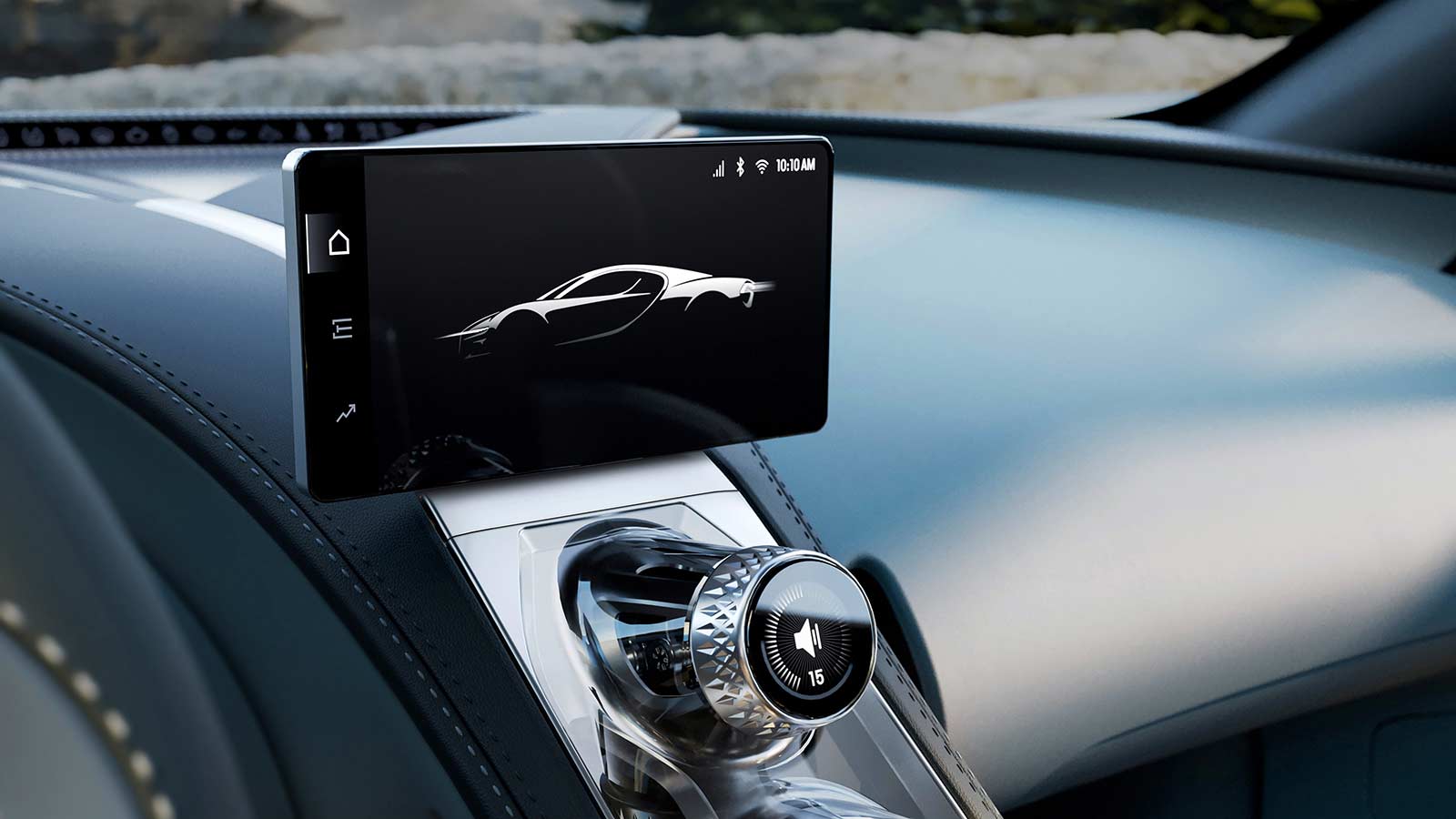 The center console blends crystal glass and anodized aluminum, showcasing the intricate mechanisms of the switches and the engine start lever. The interior materials are authentic and meticulously crafted, with each component designed to endure and age gracefully, much like a fine timepiece.