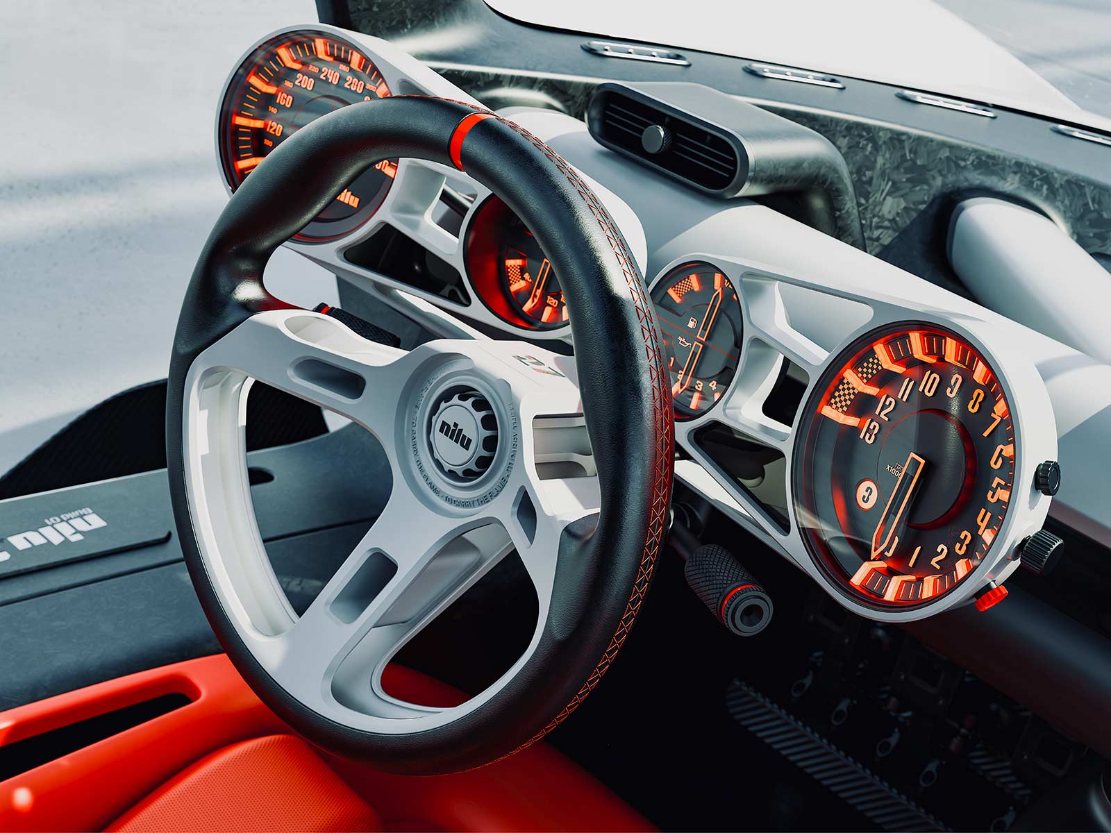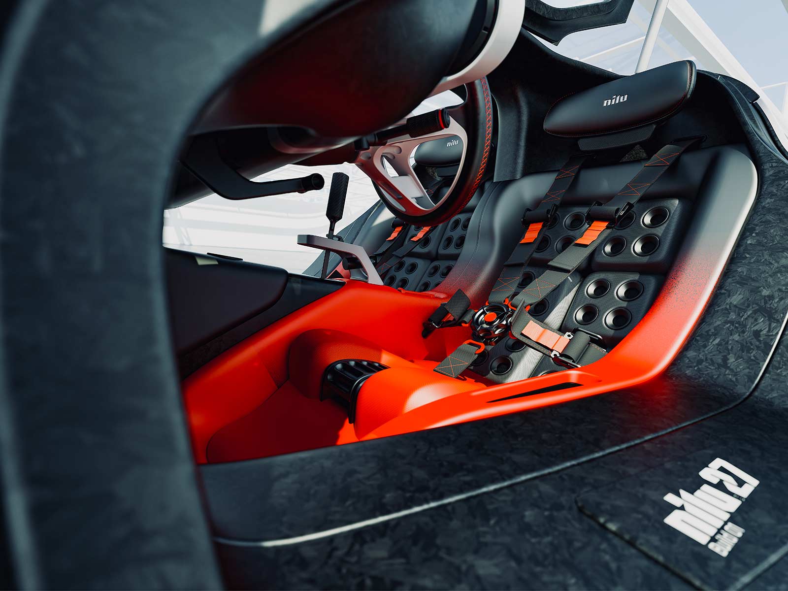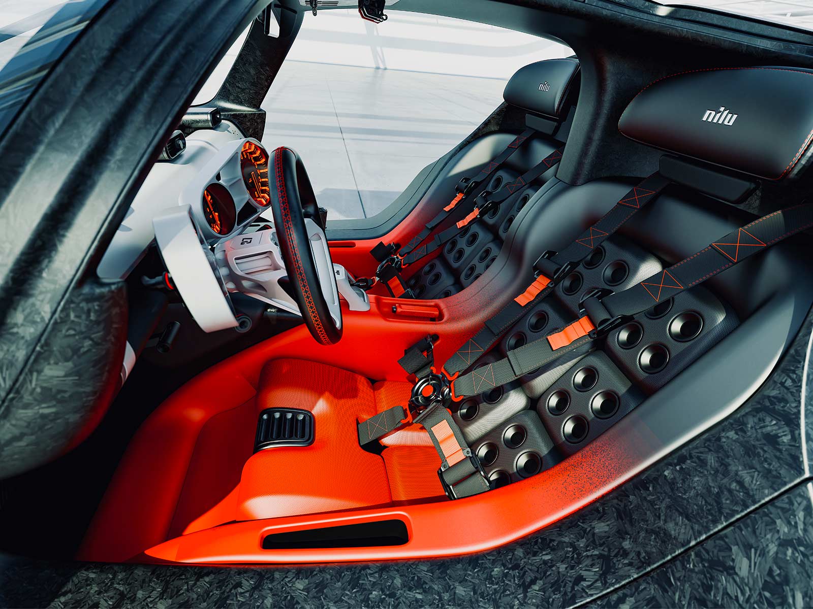 The NILU hypercar boasts a bespoke carbon fiber monocoque chassis and lightweight aluminum-alloy tubular subframes, diverging from modern composite subframes to enhance mechanical access and heat dissipation. The focus on a tactile, manual driving experience is evident in every aspect of the vehicle. The cabin is designed with ideal ergonomics and safety in mind, featuring a low roofline, compact dimensions, and manually adjustable controls, including a seven-speed open-gate manual transmission.