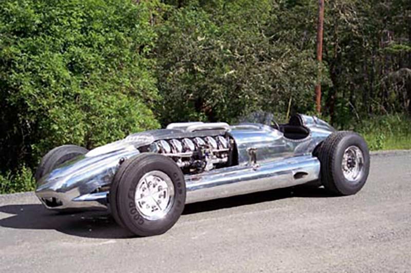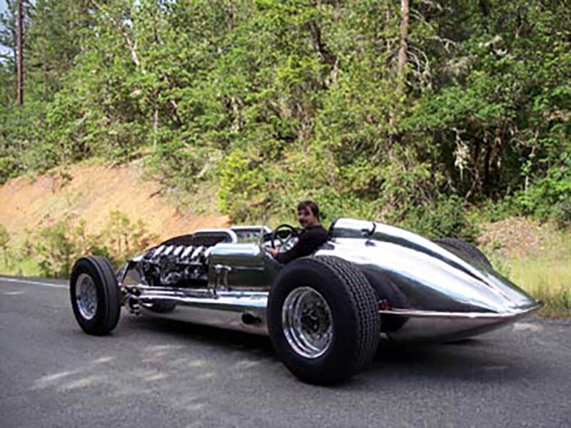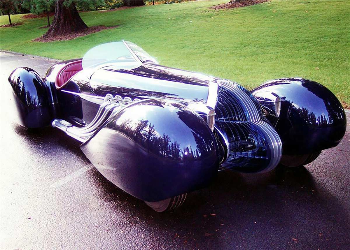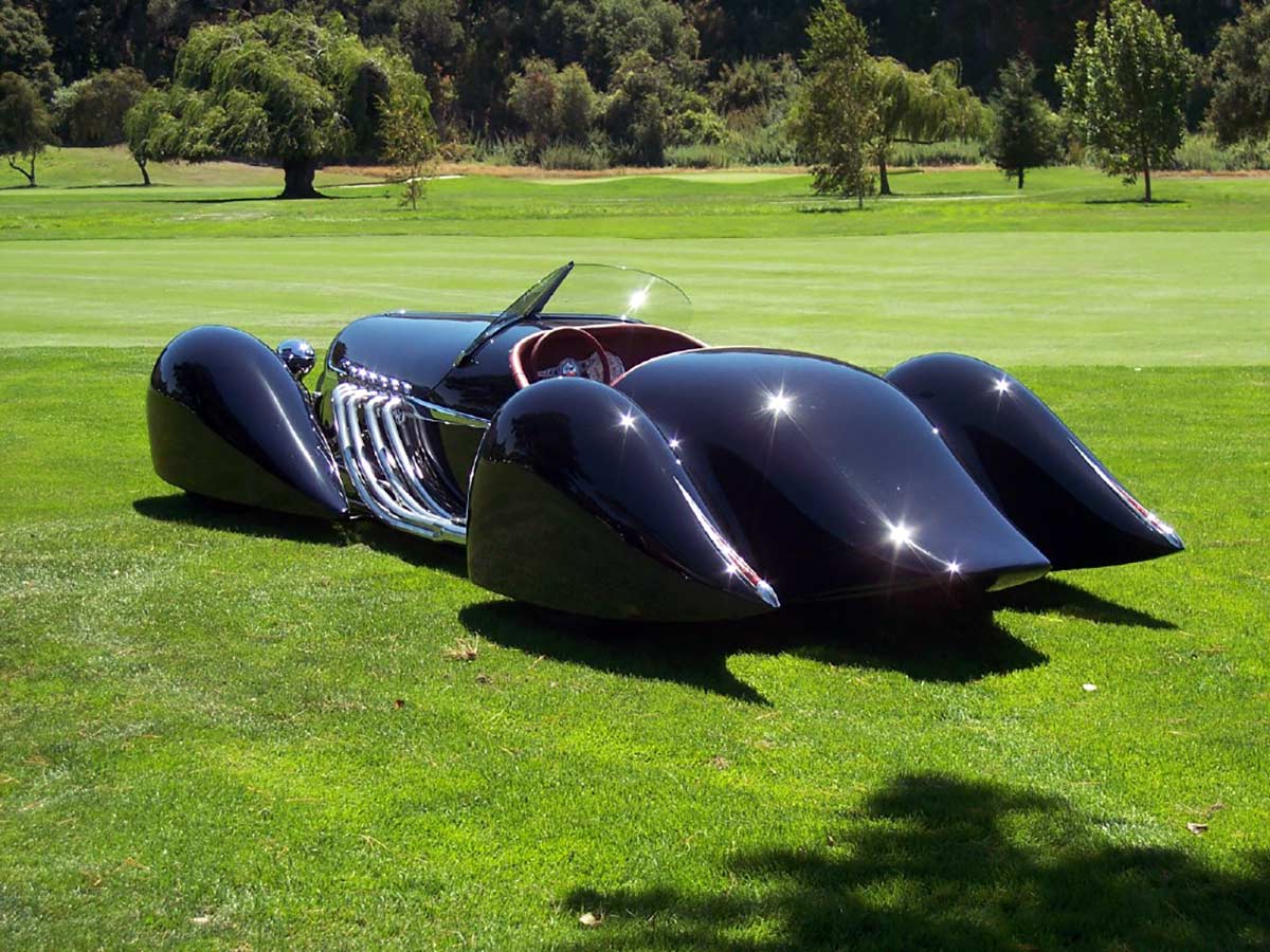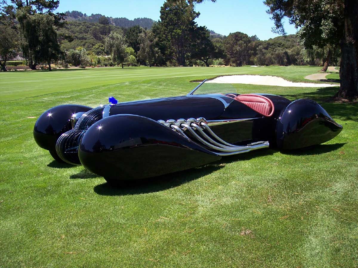 With a hand-formed aluminum body and a chassis finished to show quality with nickel plating or powder coating, the B-702 is a stunning sight. The interior is wrapped in maroon leather, and the oversized speedometer cluster is reminiscent of classic Lincoln Zephyr models. It debuted at the Quail Lodge in Monterey, CA, in August 2007 and has since captivated audiences with its blend of American muscle and refined design.