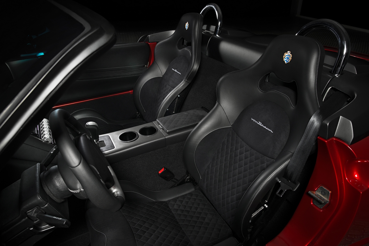 The Coupé Pack includes a stylish lightweight roof that enhances the car’s classic graceful lines. The roof is made of carbon fibre/epoxy. The integrated safety cage is made of high-strength chromium molybdenum 4130N and “Docol R8” tubes. The safety cage replaces the two smaller roll bars to offer improved safety as well as greater chassis rigidity. There is a spacious extra storage area behind the car’s seats, where the cabriolet lid, soft top, and twin roll bars would otherwise be.