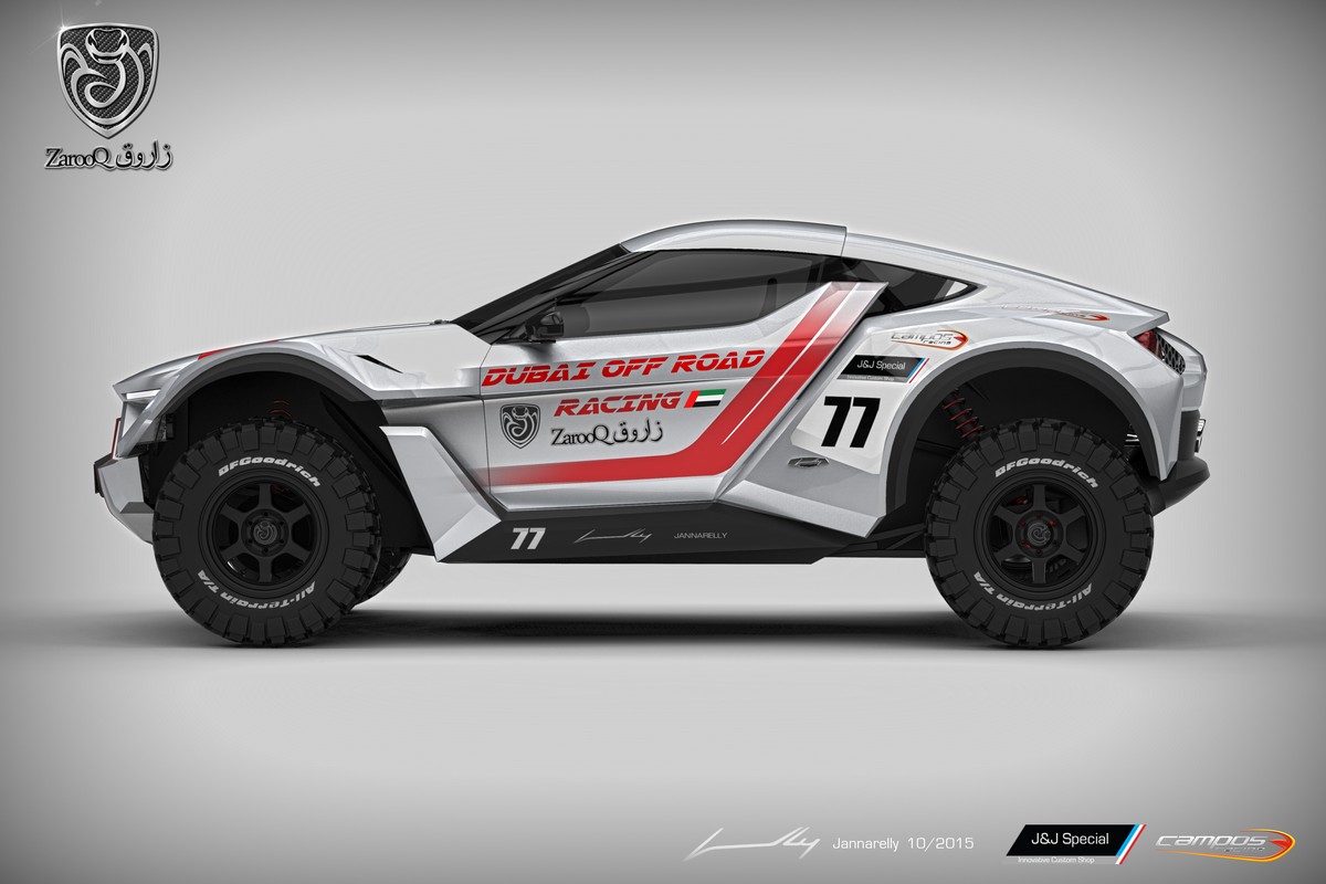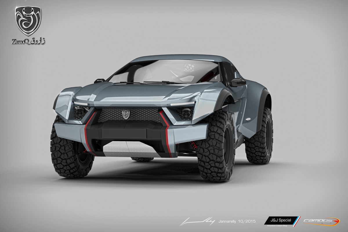 The name was inspired by the Schockari Sand Racer, the fastest and most agile snake in the desert, in Emirati: Zarooq زارÙÙ / . The car combines high performance with innovative features and an iconic look. It’s a powerful racing car yet designed to be on the road as well, and tailored to the desert with a closed cockpit and air-conditioning.