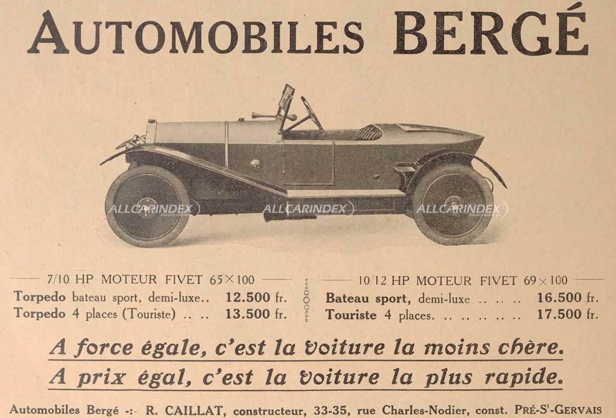 Berge was a French automobile manufacturer established in 1923 by M. Caillat in Pre St Gervais, Seine. The company focused on producing conventional light cars that were powered by various four-cylinder engines, including 7/10 and 10/12 CV engines from the Fiver company, as well as a 12 CV engine from Janvier.