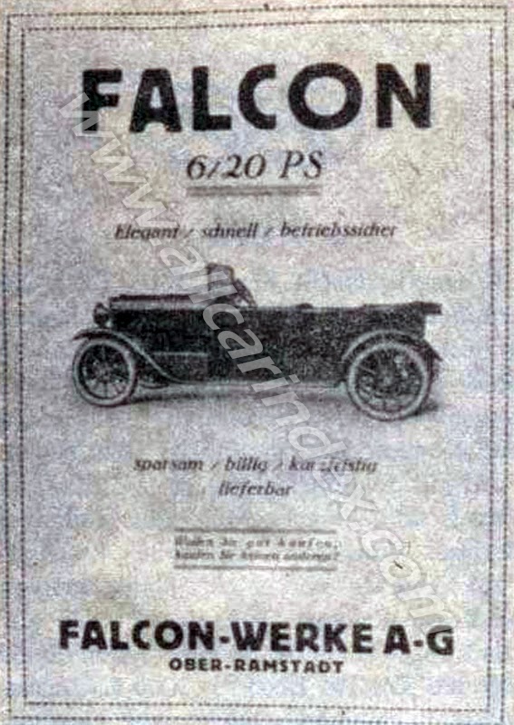 Falcon was a German automobile manufacturer that operated from 1921 to 1926. The company was initially established as Falcon Automobilwerke GmbH in Sontheim before relocating to Ober-Ramstadt, where it was restructured as Falcon-Werke AG in 1922.