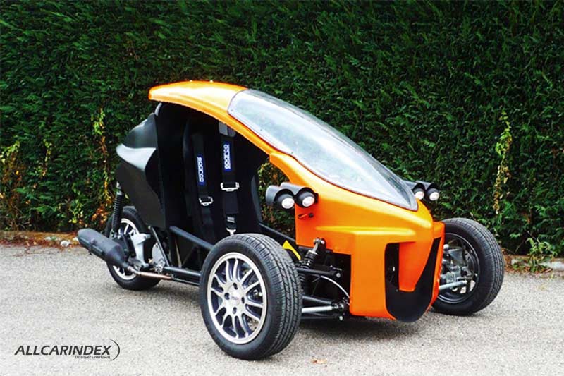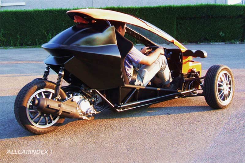 Tercyclo was an Italian micro–three-wheeler brand that offered a cabin-scooter–style kit in the early 2010s. Conceived as an ultra-compact urban vehicle, it used a steel tube space-frame with a GRP body and double-wishbone front suspension, sized 2350×1500×1250 mm on a 1850 mm wheelbase. The kit (listed at €3,500 plus VAT in 2011) included chassis, body panels, windscreen, roll bar, steering gear, front brakes and suspension, leaving the buyer to bolt on a complete scooter power unit and its original ancillaries; options mentioned at launch included a brand-new scooter engine, an electric reverse gearbox, and a GRP canopy. The design was attributed to Italo F. Sciacca (FuoriserieDesign, Milan), with intended engine choices ranging from 50 to 250 cc, positioning the vehicle as a nimble alternative to conventional cars for short city trips.