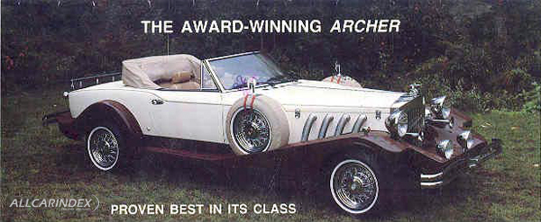 The vehicles produced by Archer were built on a Lincoln chassis and featured a Chevrolet engine. Notably, the body design incorporated elements from the Fiat 124 Spyder, with the original body being modified. The modifications included cutting off the body at the firewall and adding a long fiberglass nose, along with running boards and a vertical grille, which contributed to a design aesthetic reminiscent of other neoclassic brands such as CLENET and EXCALIBUR.