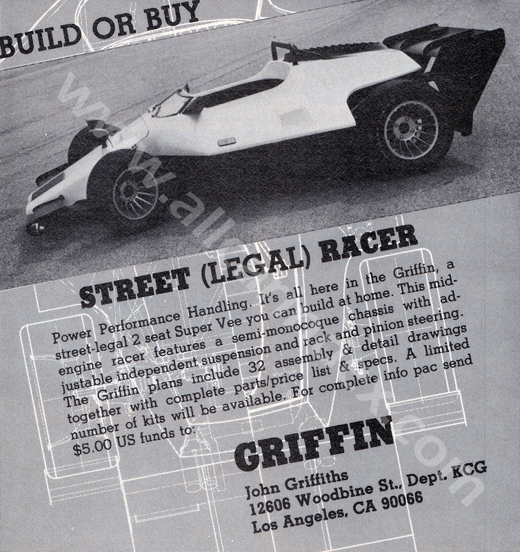 The bodywork of the Griffin resembled that of a two-seat formula race car, complete with aerodynamic wings at both ends. In 1980, the car could be acquired either as a set of plans for self-assembly or as a rolling chassis priced at $15,750. Completed vehicles were also available for purchase, catering to enthusiasts looking for a ready-to-drive racing experience.