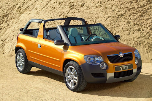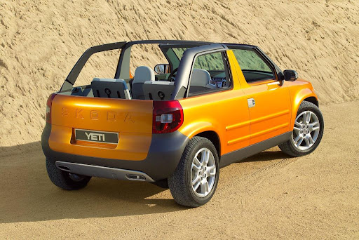The variable roof system of the Yeti was developed jointly with the renowned firm Karmann. The combination of hardtop and softtop (canvas roof) offers three variations of “open-air” travel. When driving with the roof down, the driver and passenger see the blue sky; when the rear section of the canvas roof is off, Yeti is transformed into a classic pick-up. If the crew decides to take a drive without both roof parts, they may look forward to maximum experience of a drive in an open vehicle.