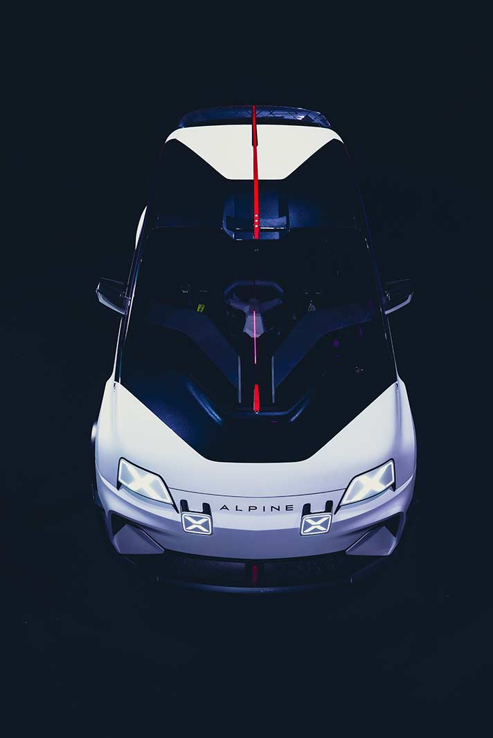 All the car's functionalities are on the centreline where the driver sits. A console built into the roof provides instant access to several features (kill switch, indicators, light settings, etc.). One thing that sets this show car apart is that it has no screens inside. That way, the driver can focus 100% on driving and racing. It does, however, have a slender head-up display, over the steering wheel, showing the essentials (for instance speed and battery charge). The driver also has a headset with a display feeding all the race-related information live: any flags the officials are waving, the track's condition, information about the other cars, etc. The link with motorsports is palpable and entices the driver and passengers to enjoy this one-of-a-kind, sense-arousing experience. The production car will be built around the same driving experience: the cockpit will revolve around the driver - the physical layout as well as the multimedia system and virtual interfaces associated with it, such as the onboard telemetry system and Alpine animations.