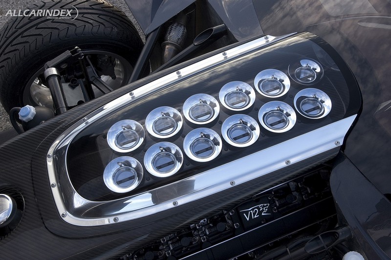 Set into the bonnet, a glazed panel reveals twelve intake trumpets reminiscent of a fairground organ.